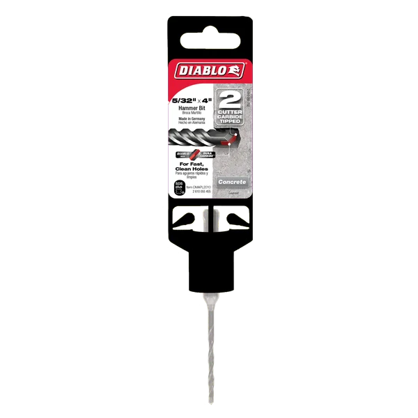 Diablo’s SDS-Plus 2-Cutter Carbide-Tipped Hammer Drill Bits provide one of the fastest and longest lasting drilling solutions on the market for concrete. Optimized with a unique brazing and hardening process, the carbide tips extends life and productivity, allowing users to drill fast, accurate holes. The Peak Point tip design allows for aggressive starts that produce clean, fast holes for common sized anchors. Optimized for maximum performance in corded and cordless SDS Plus rotary hammers.