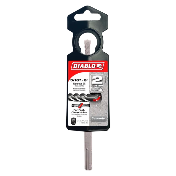Diablo’s SDS-Plus 2-Cutter Carbide-Tipped Hammer Drill Bits provide one of the fastest and longest lasting drilling solutions on the market for concrete. Optimized with a unique brazing and hardening process, the carbide tips extends life and productivity, allowing users to drill fast, accurate holes. The Peak Point tip design allows for aggressive starts that produce clean, fast holes for common sized anchors. Optimized for maximum performance in corded and cordless SDS Plus rotary hammers.