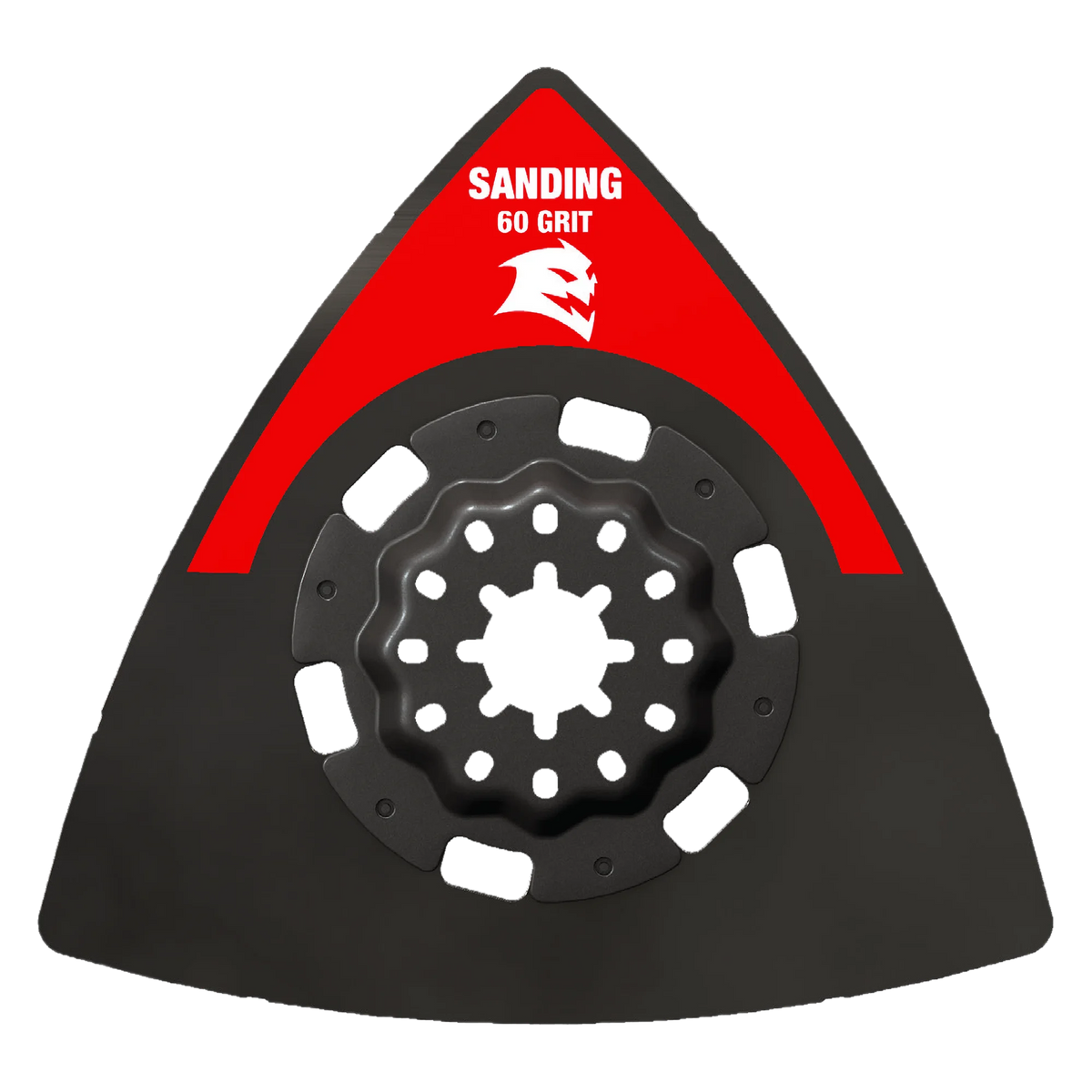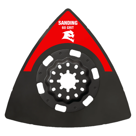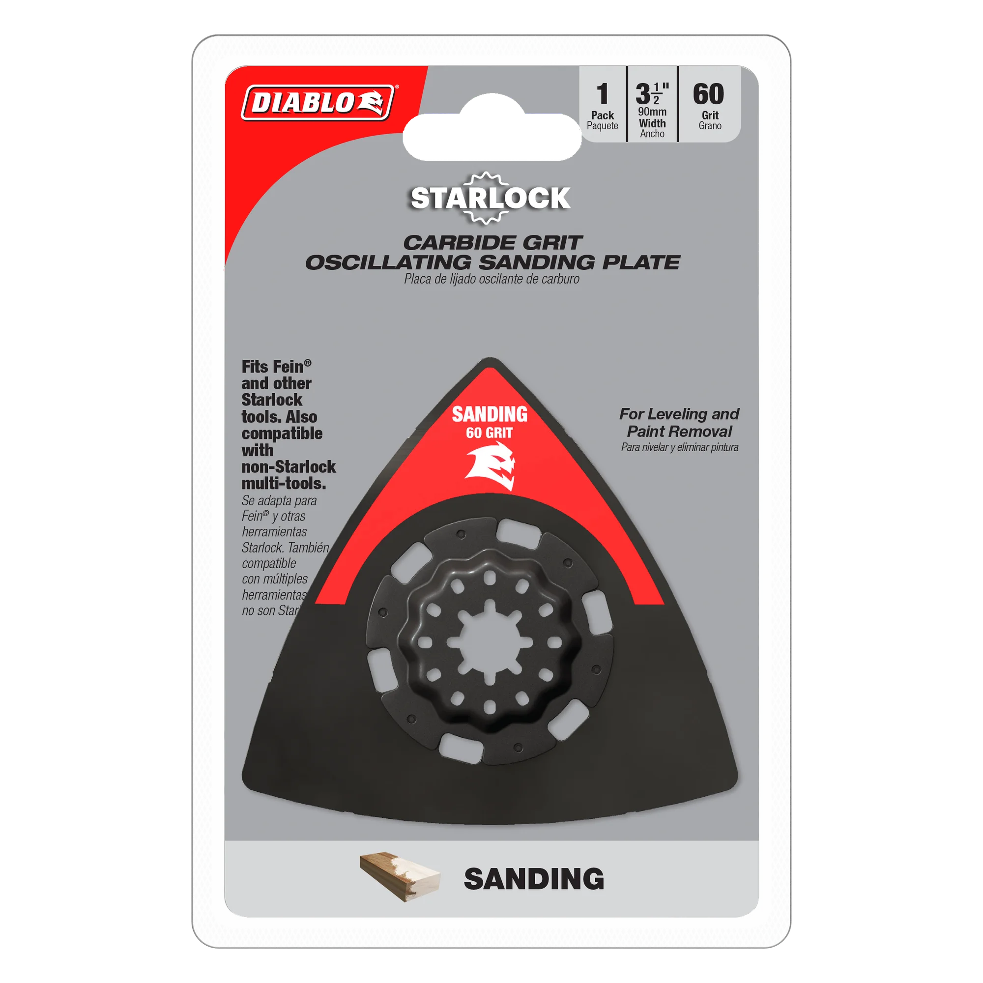 Diablo’s Starlock oscillating sanding plates feature application specific designs that deliver maximum durability and longer life in sanding applications. A 60-Grit sanding plate quickly removes and levels paints and varnishes. Open-coat carbide grit reduces material build-up and clogging for longer life. Tool free quick-change interface fits Fein and other Starlock tools; also compatible with most non-Starlock multi-tools.