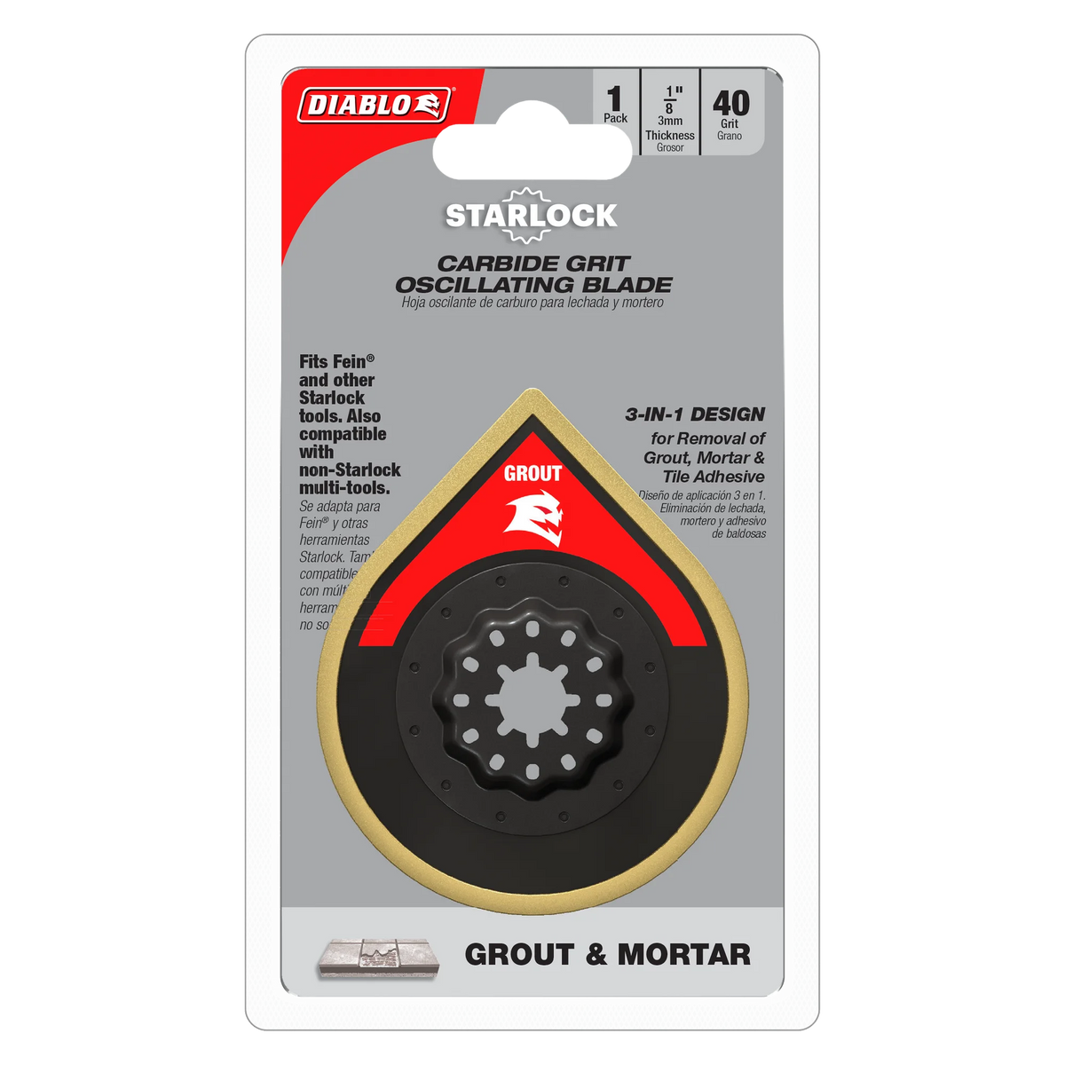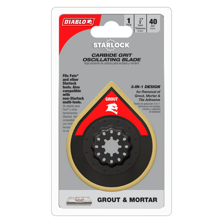 Diablo’s Starlock oscillating sanding blades feature application specific designs that deliver maximum durability and longer life in grout, mortar and tile adhesive removal applications. The 40-Grit sanding plate removes material and routes joints on wall and floor tiles. A Carbide Grit Tip removes grout and mortar from hard to reach areas and tight corners. Tool free quick-change interface fits Fein and other Starlock tools; also compatible with most non-Starlock multi-tools.