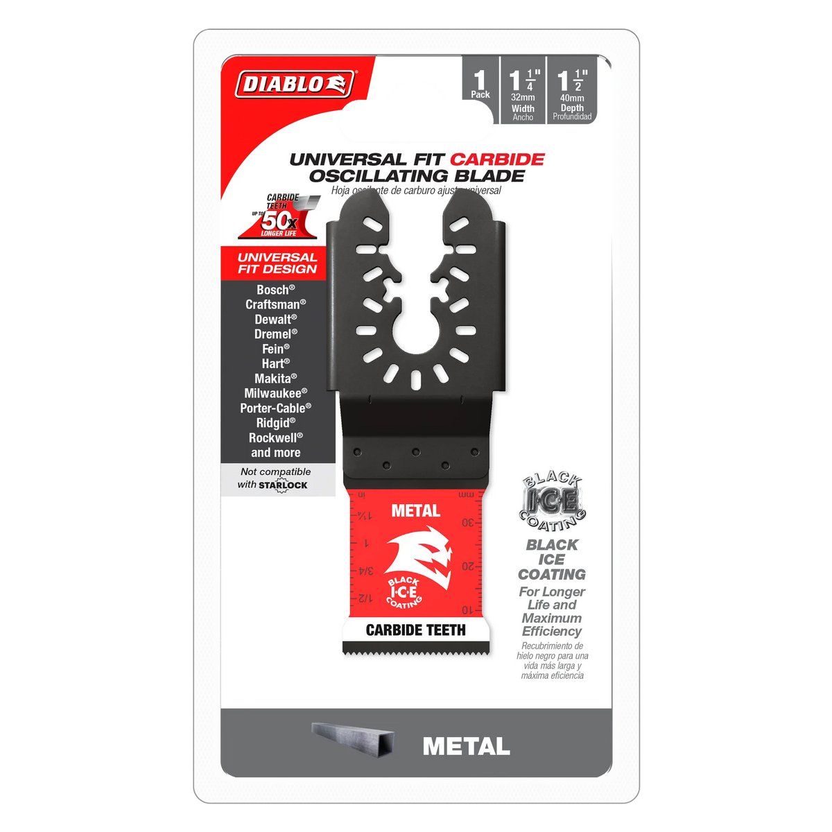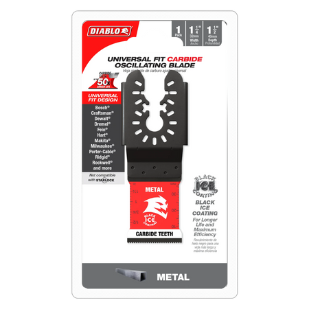 Diablo’s universal fit carbide oscillating blades feature application specific designs that deliver extreme durability and superior cutting life in metals. High-performance carbide teeth deliver an unmatched up to 50X longer cutting life versus standard bi-metal blades. An optimized blade and tooth design along with Black I.C.E. (Industrial Cooling Element) protects the blade's cutting edge against wear for extreme durability and longer blade life. The blade’s universal fit, adapter-free design easily attaches to most tools, with the exception of Starlock tools.