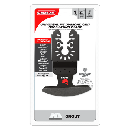Diablo’s universal fit diamond grit oscillating blades feature application specific designs that deliver maximum durability and longer life grout removal applications. An optimized blade design delivers faster material removal in hard to reach areas. The blade’s universal fit, adapter-free design easily attaches most tools, with the exception of Starlock tools.