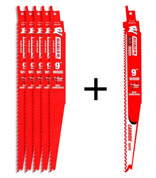 Diablo DS0912BW5PC, 5+1 9” 4/6TPI Bi-Metal Reciprocating Saw Blades for Nail Embedded Wood Cutting
