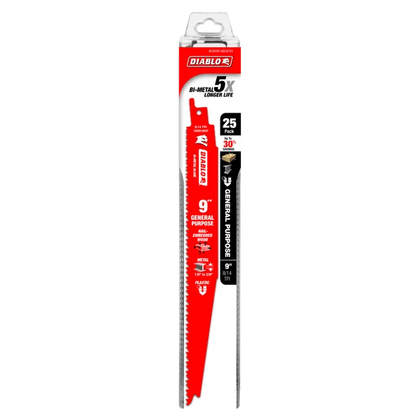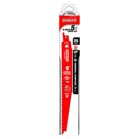 Diablo's Bi-Metal Reciprocating Saw Blades for General Purpose Cuts are the most innovative blades on the market, delivering up to 5X the performance of standard blades. These high-performance blades feature bi-metal technology that delivers up to five times longer life of standard blades on the market. Diablo's’s patented variable tooth technology provides faster cuts with less vibration.