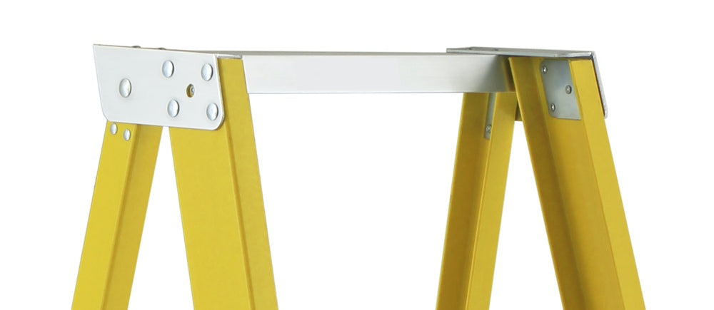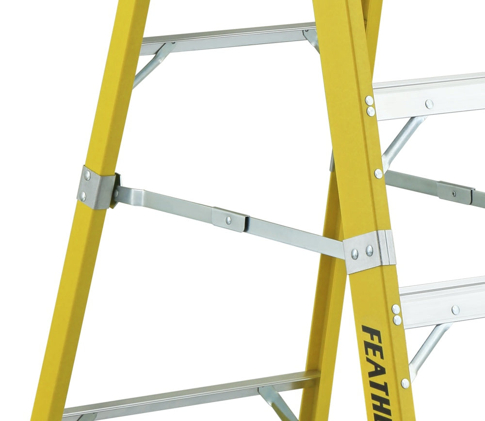 This Featherlite 12 foot industrial platform step ladder has a 300lb load capacity, rated ANSI Type IA. It features a slim, gapless slip-resistant platform with a top rail guard. This ladder is equipped with heavy duty gusset bracing, heavy-duty slip resistant boots, wrap-around spreader braces, and double-rivet step construction. The Featherlite 6512 platform step ladder meets or exceeds the safety standards set by ANSI, CSA, and OSHA. Model 6506 displayed.