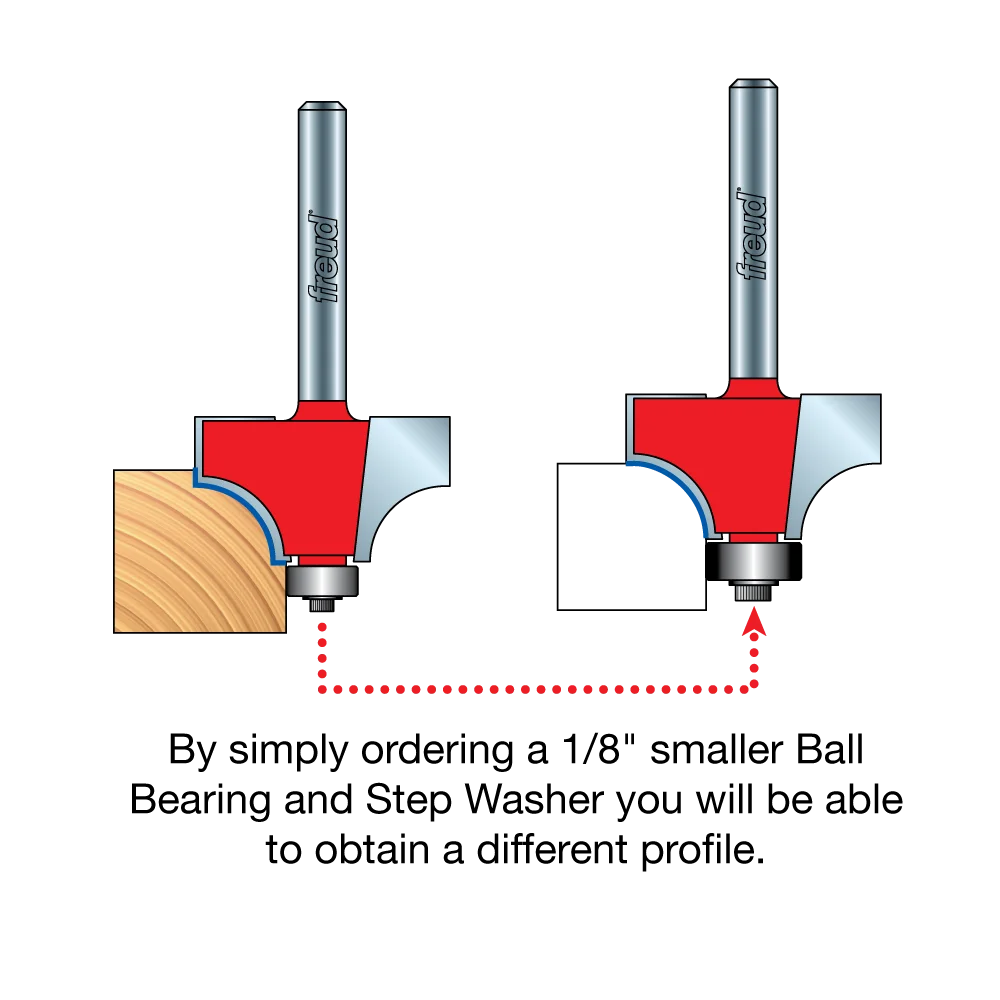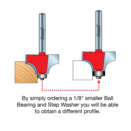 Add an attractive bead profile to furniture and millwork with Freud beading bits, or soften the edge of almost any square corner. These bits include a bearing that creates an inset bead at the bottom of the radius. For rounding over work without the inset bead, add a Freud 62-104 bearing and 62-313 step washer. Use to rout solid wood, plywood or composites with hand-held or table-mounted routers.