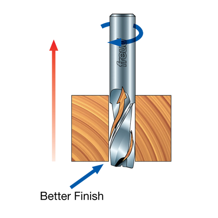 Solid carbide up spiral bits combine effective chip removal with a cut quality that can’t be matched by standard straight bits. Ideal for through-cuts, mortises and deep blind holes in production applications. The up spiral design provides the best cut quality on the bottom surface of the material. Use these bits in CNC, hand-held or table-mounted routers.