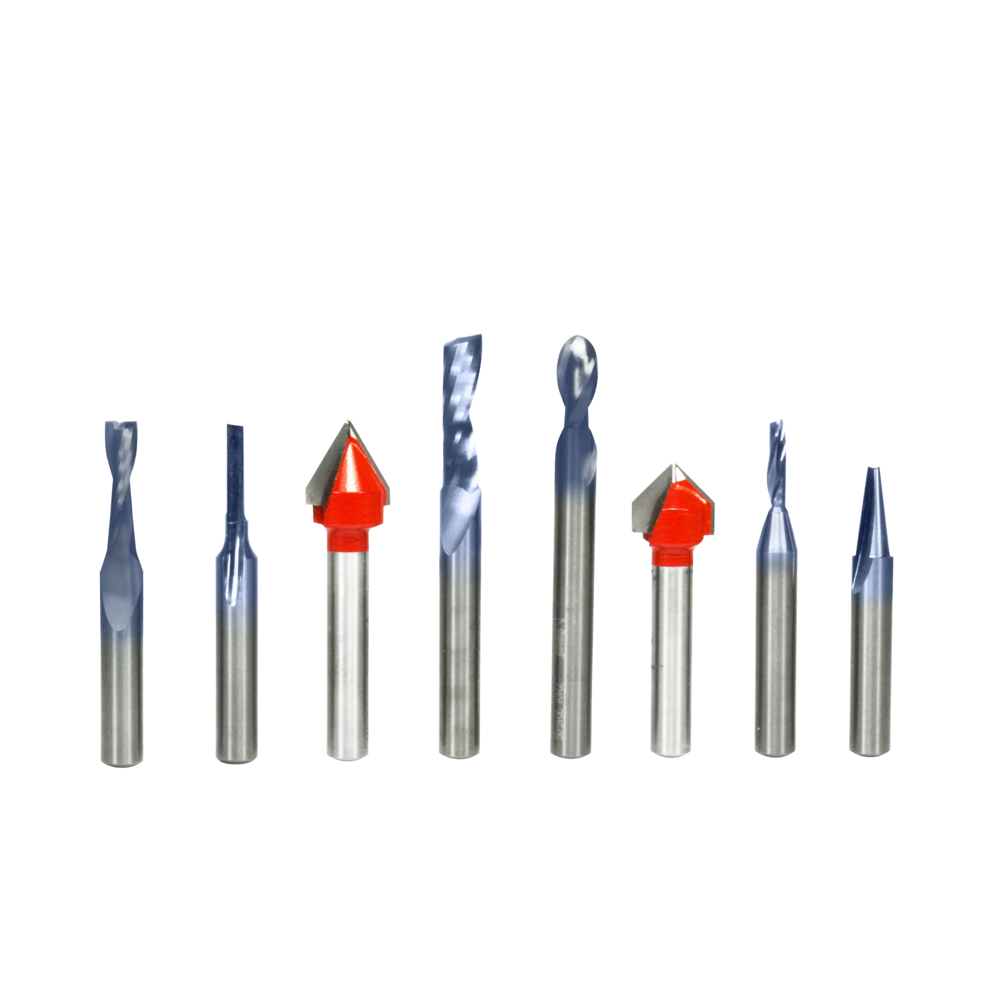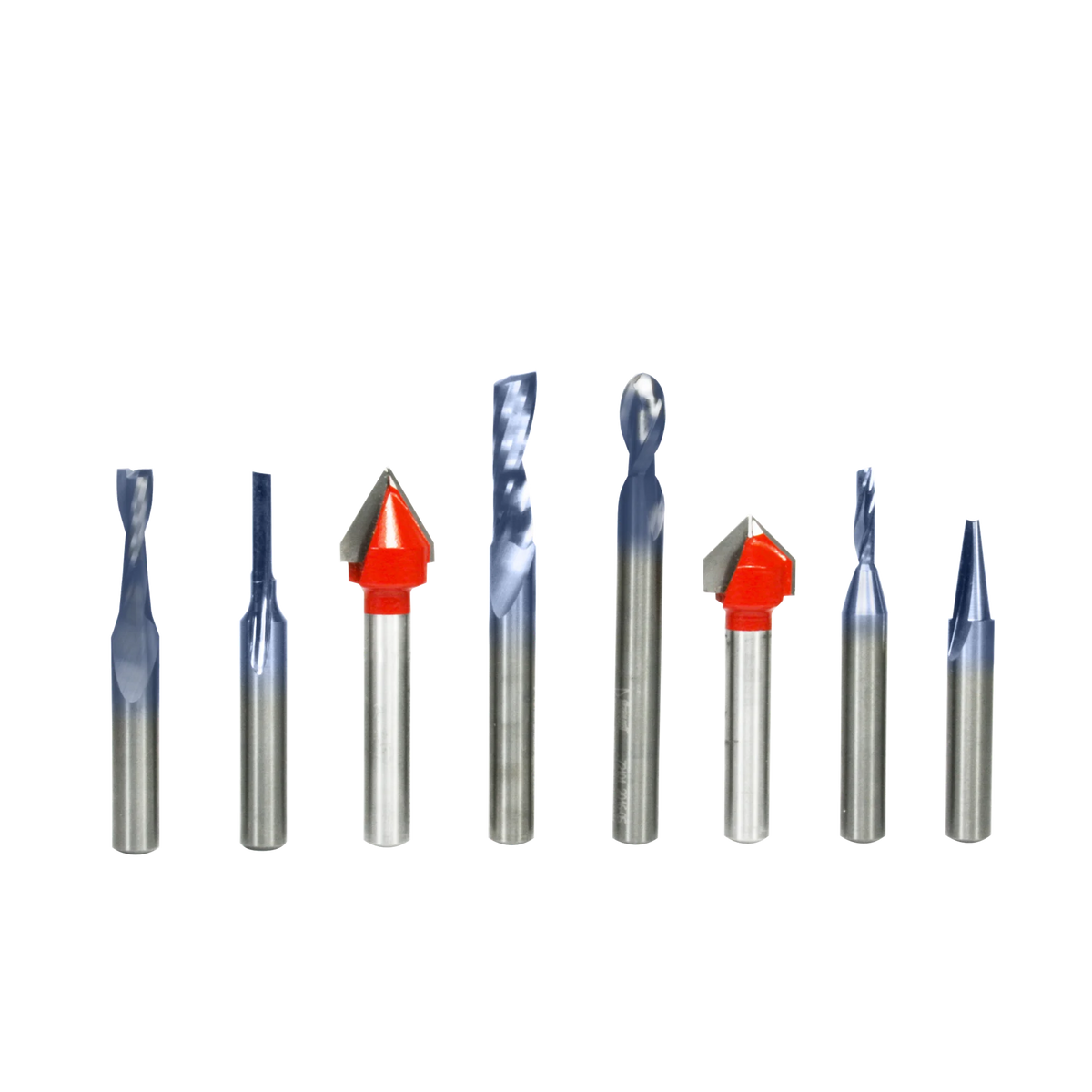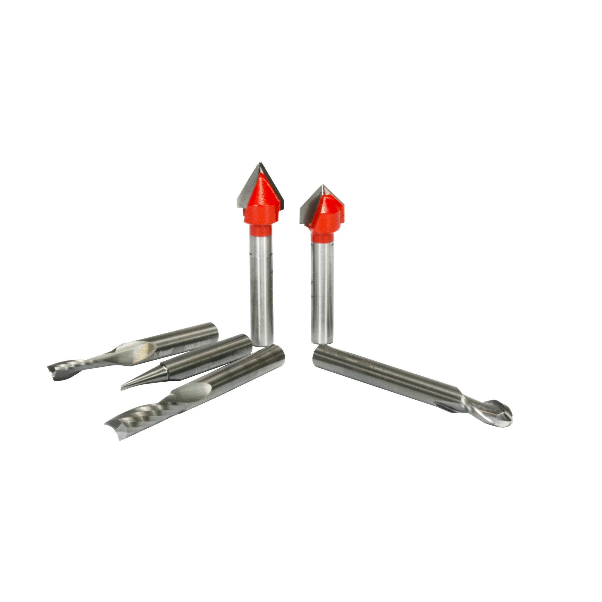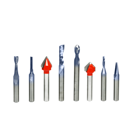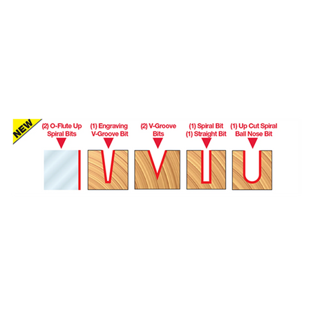 8 piece General Purpose CNC Router Bit Set, 1/4 Inch Shank specifically designed for a wide variety of applications. Set Includes: Up Cut Spiral Ball Nose- Solid Carbide (#72-101), 7.5º x 3/16" Engraving V-Groove- Solid Carbide (#70-103), O-Flute Up Spiral Bit -Solid Carbide (#73-762), Up Cut Spiral Solid Carbide (#75-101), O- Flute Up Spiral Solid Carbide (#75-025), O- Flute Straight Solid Carbide (#71-040), 1/2" 90º Degree V-Groove (#20-104), and 1/2" 60º Degree V-Groove (#20-152).