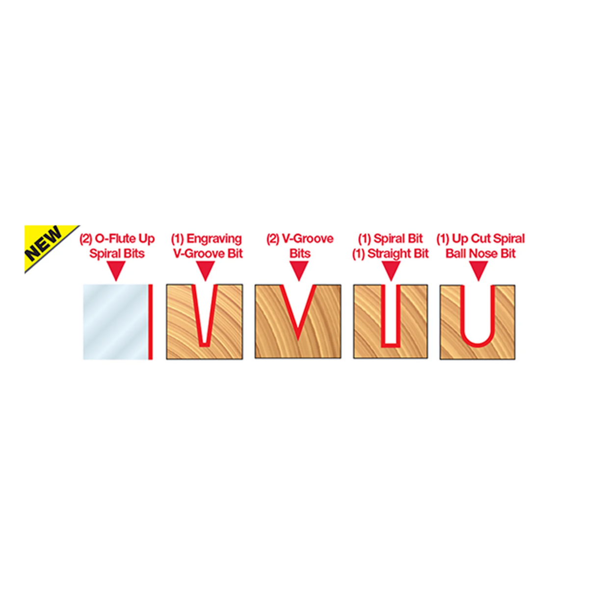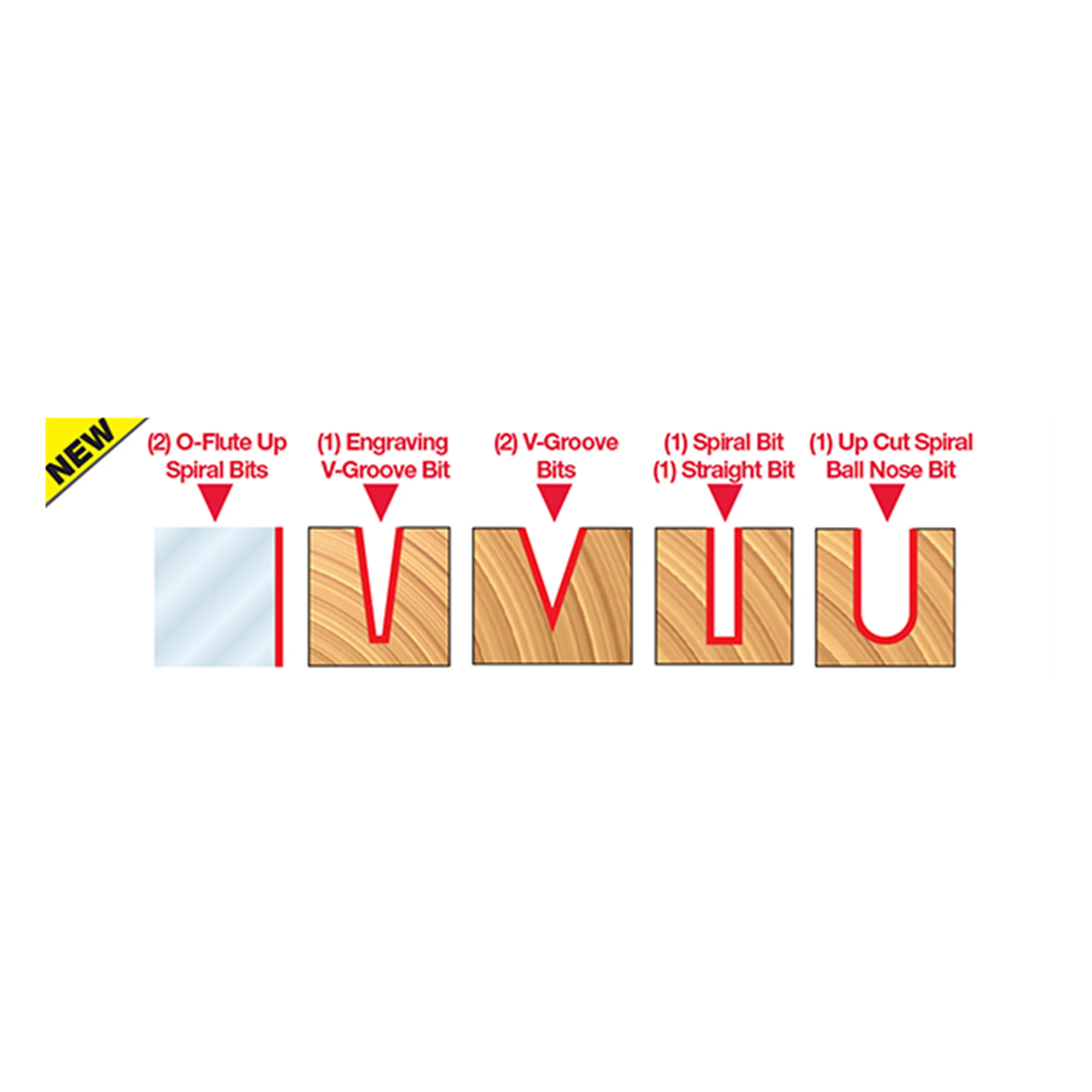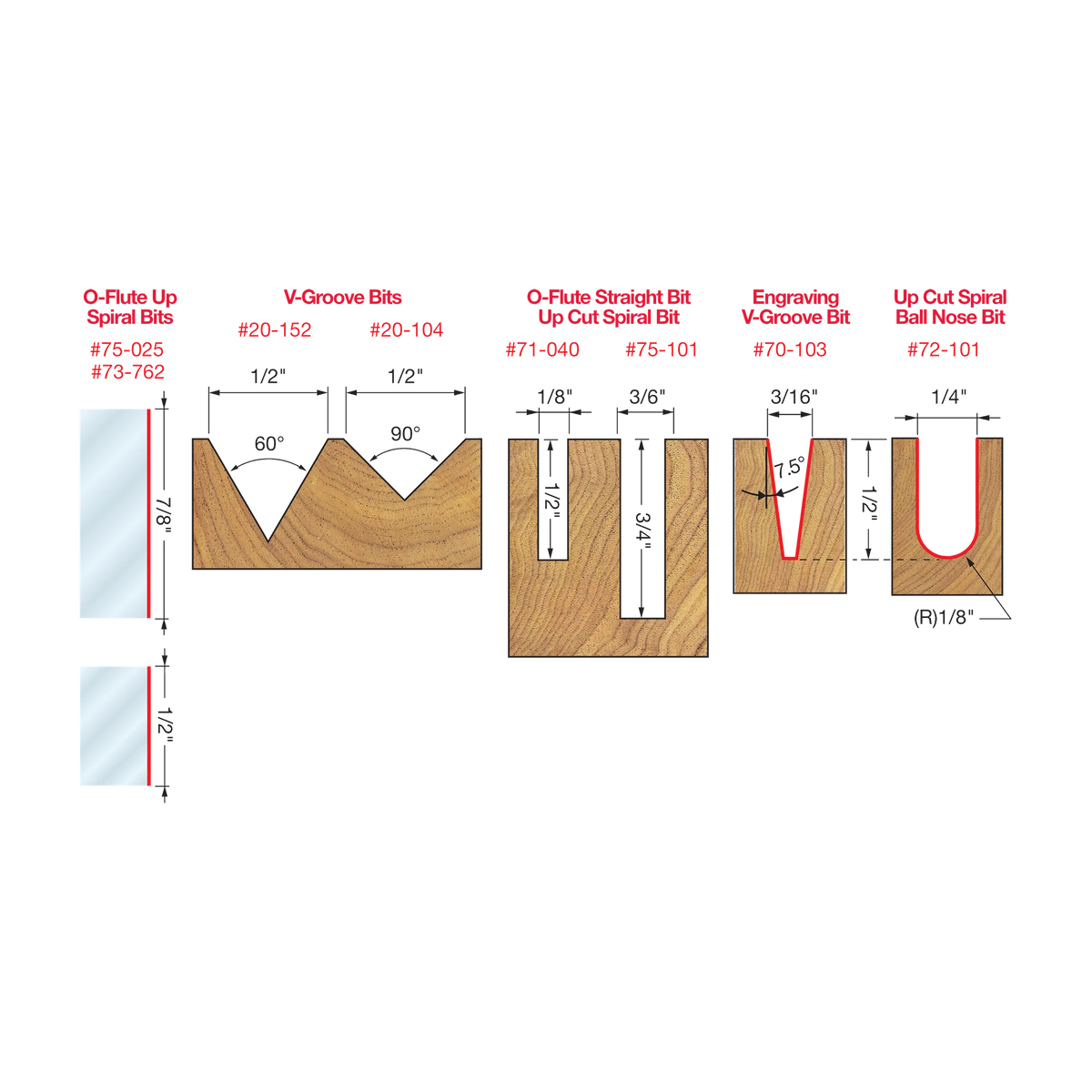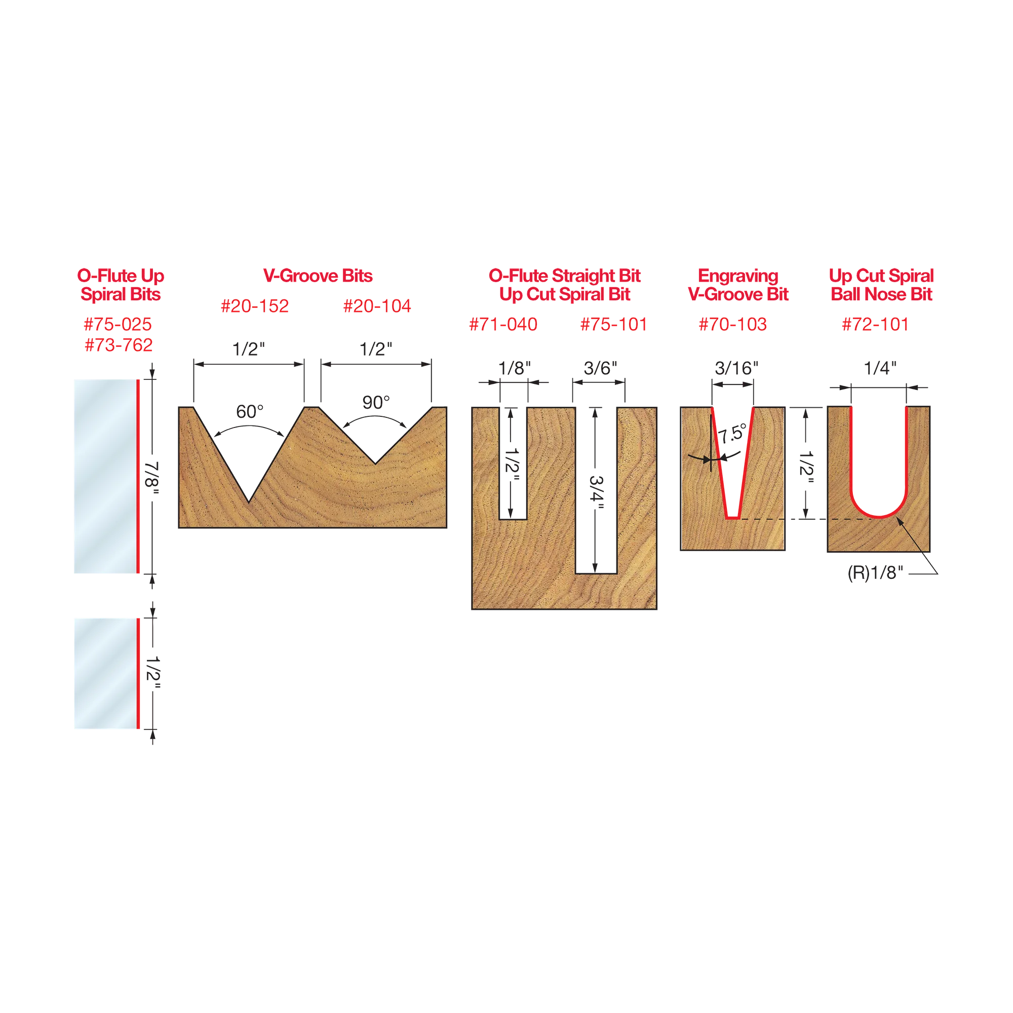 8 piece General Purpose CNC Router Bit Set, 1/4 Inch Shank specifically designed for a wide variety of applications. Set Includes: Up Cut Spiral Ball Nose- Solid Carbide (#72-101), 7.5º x 3/16" Engraving V-Groove- Solid Carbide (#70-103), O-Flute Up Spiral Bit -Solid Carbide (#73-762), Up Cut Spiral Solid Carbide (#75-101), O- Flute Up Spiral Solid Carbide (#75-025), O- Flute Straight Solid Carbide (#71-040), 1/2" 90º Degree V-Groove (#20-104), and 1/2" 60º Degree V-Groove (#20-152).