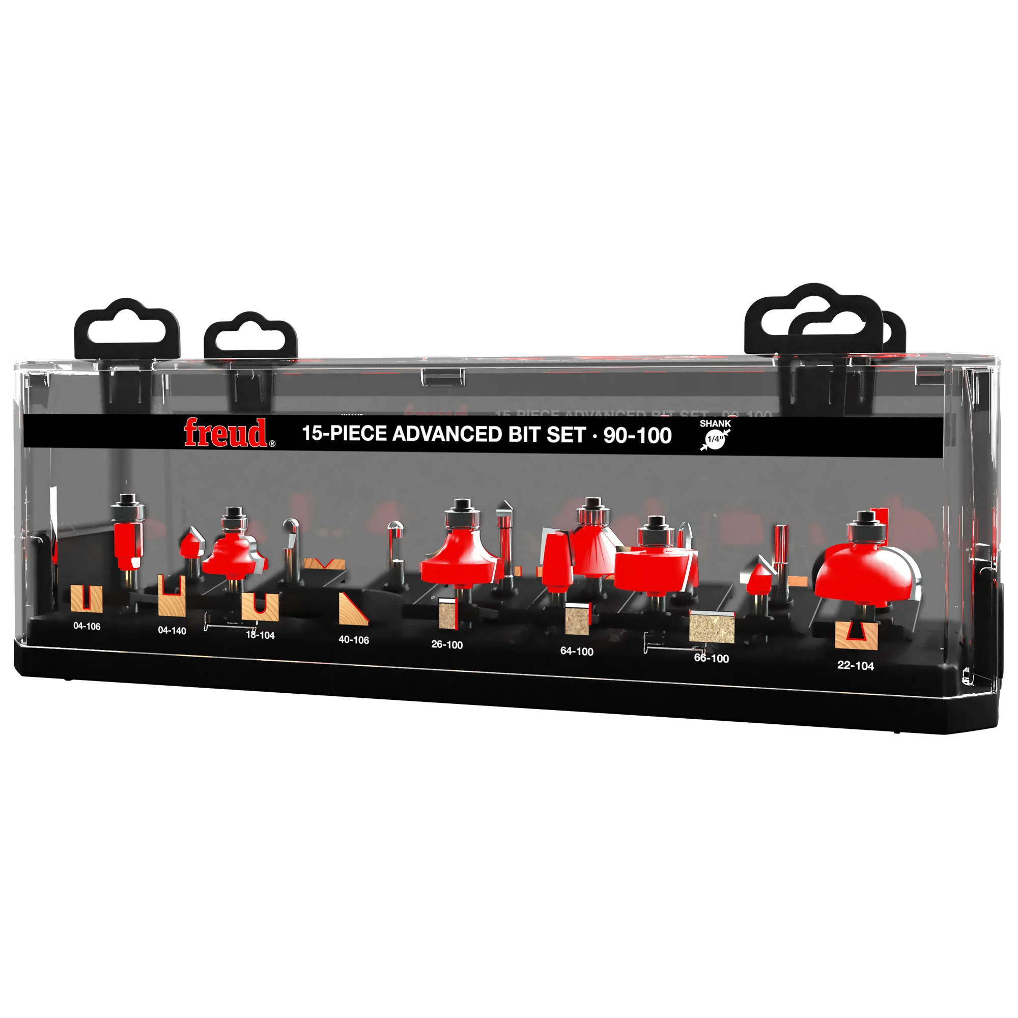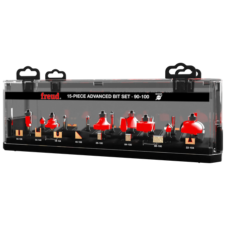 Freud's 15 Piece Advanced Set offers a wide variety of useful bits, from Rounding Over and “V” groove to chamfering to flush trim and much more. All bits feature Freud's TiCo carbide and Perma-SHIELD® Coating, and come packed in an attractive wooden shadow box case. All bits have 1/4" shanks, and can be used in hand-held or table-mounted routers.