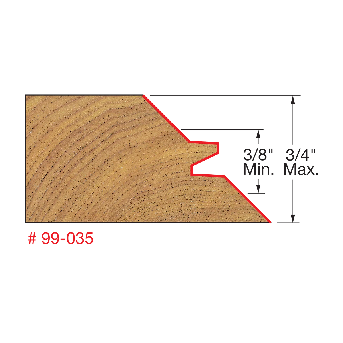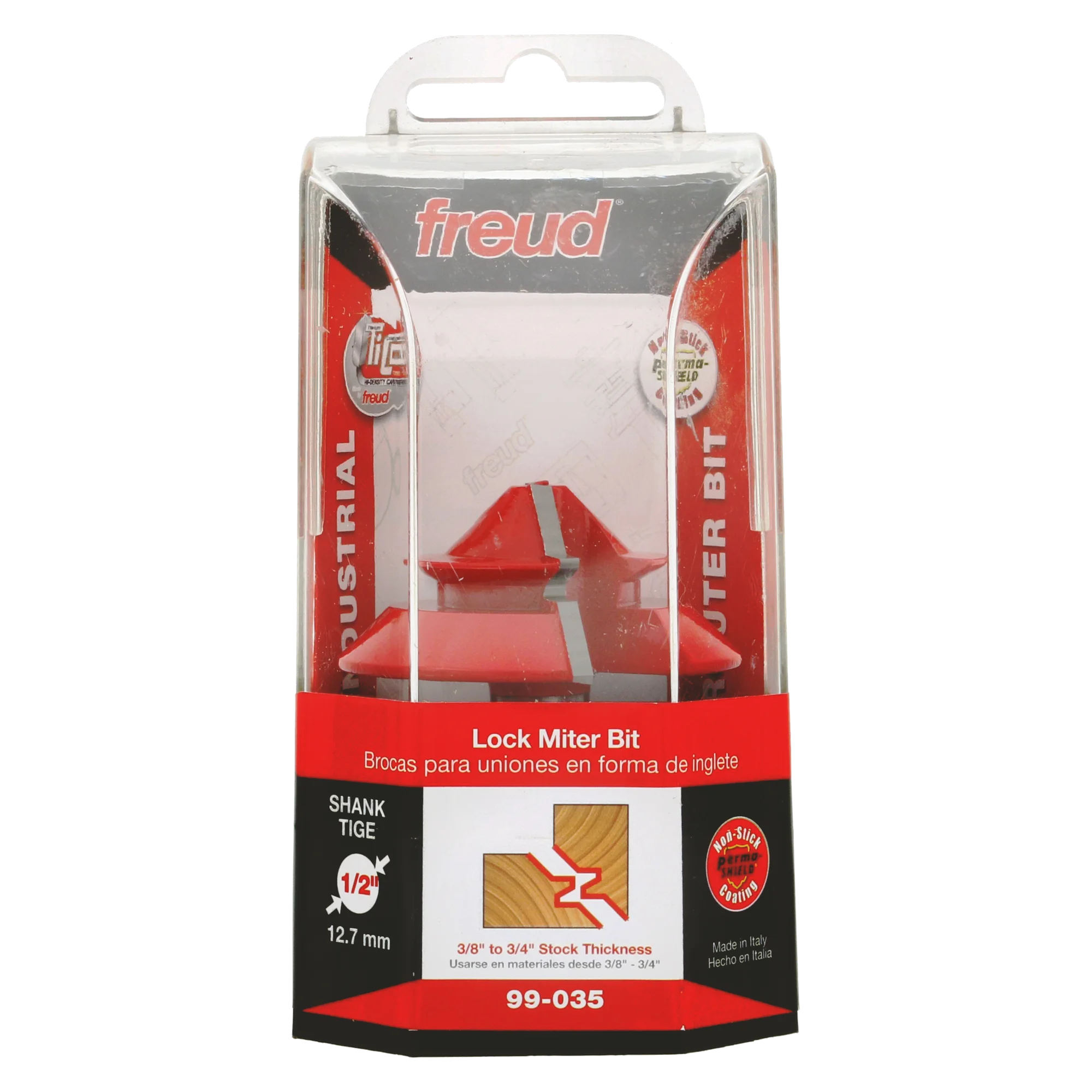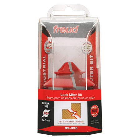 Create rock-solid interlocking corner joints with Freud Lock Miter Bits. For 90 degree joints use the 99-034 or 99-035 bits. These bits are designed to rout one piece horizontally on the router table, and the other piece standing vertical. For precise 45 degree joints us the 99-043 set, with one bit routing the tongue and the other bit routing the groove. For routing solid hardwood or softwood on table mounted routers or CNC machines only.