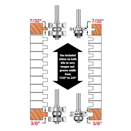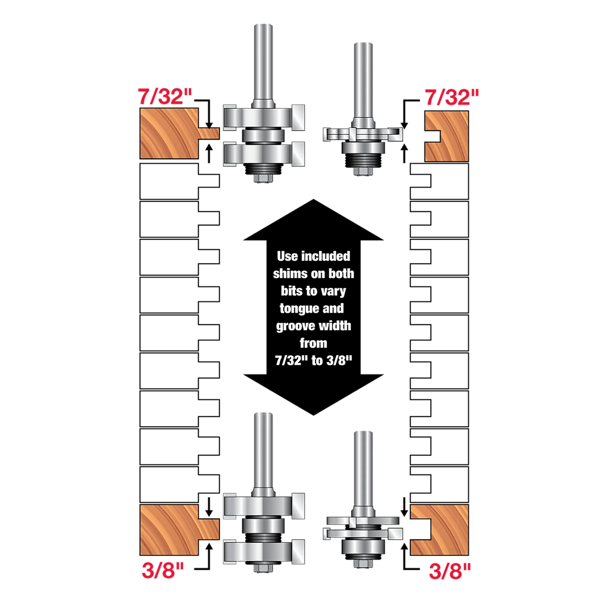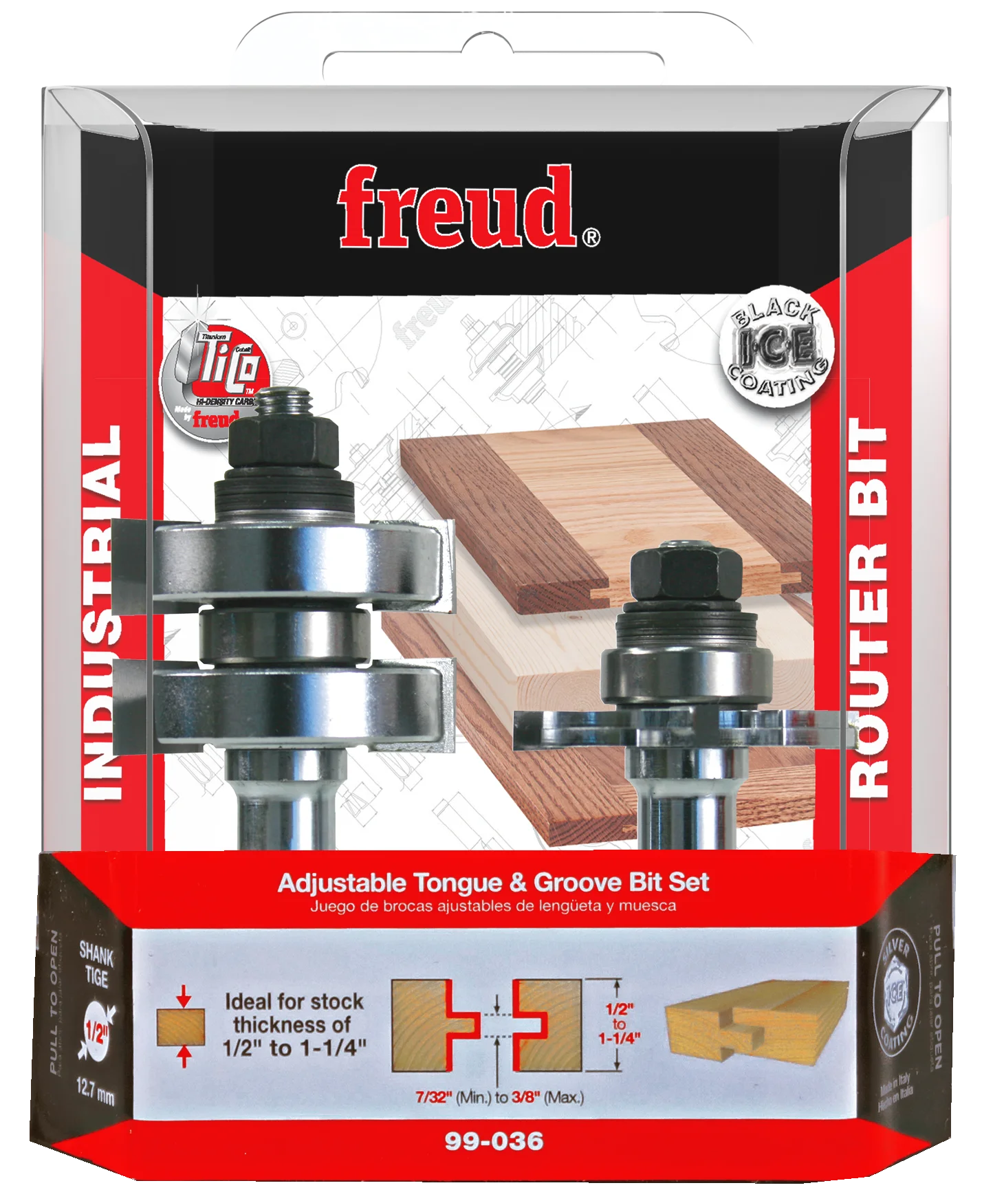 Freud's patented Adjustable Tongue and Groove Set is the ideal set for building Shaker-style cabinet doors, or any project requiring precise tongue & groove joints with perfect finished surfaces. The exclusive design features cutters with opposing shear angles to eliminate chipping on both the top and bottom surfaces of your work. And the spacer system allows adjustment at .002" increments to produce joints in 1/2" to 1-1/4" thick material with grooves from 7/32" to 3/8" deep. Bits are 1/2" shank and should be used in table-mounted routers.