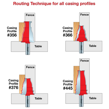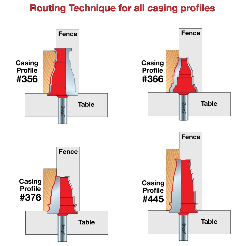 Freud's family of Casing Bits creates industry standard casing profiles #356, #366, #376, and #448, four of the most common shapes for door and window trim. These bits allow woodworkers and carpenters to pick the wood species that best suits their project. Use with CNC or table-mounted routers to mill hardwood or softwood molding.