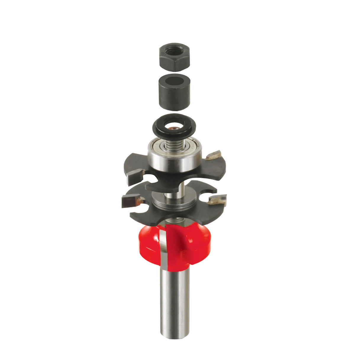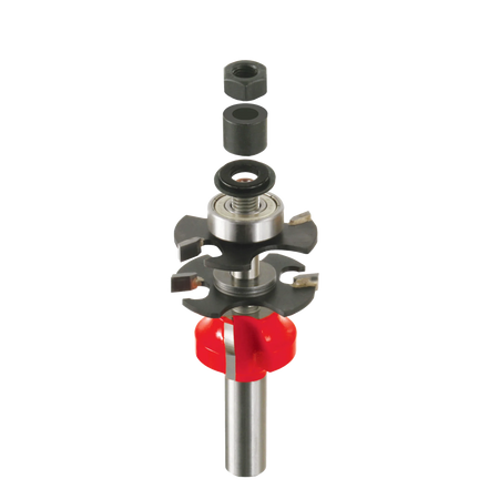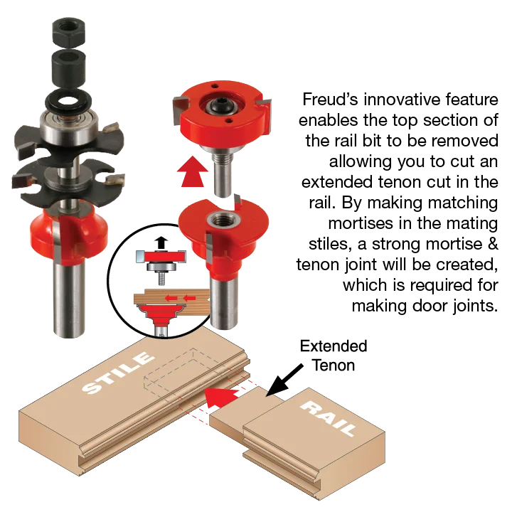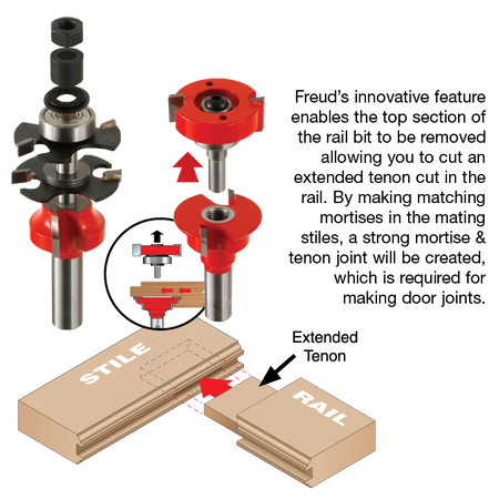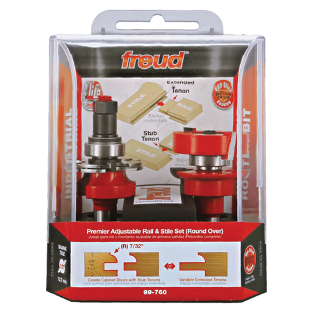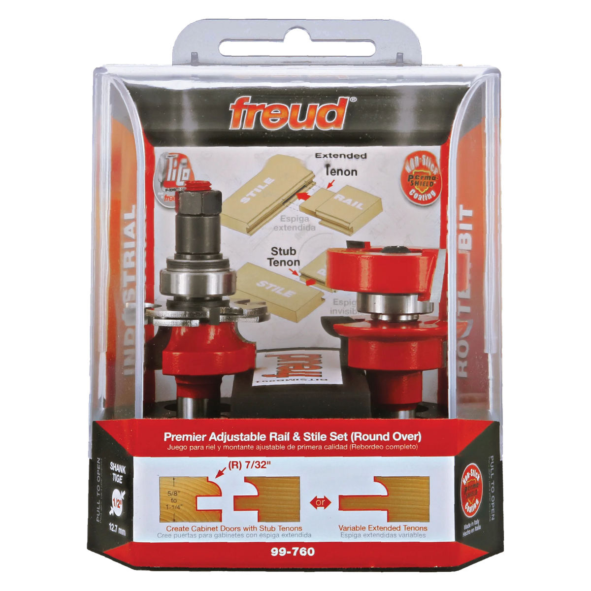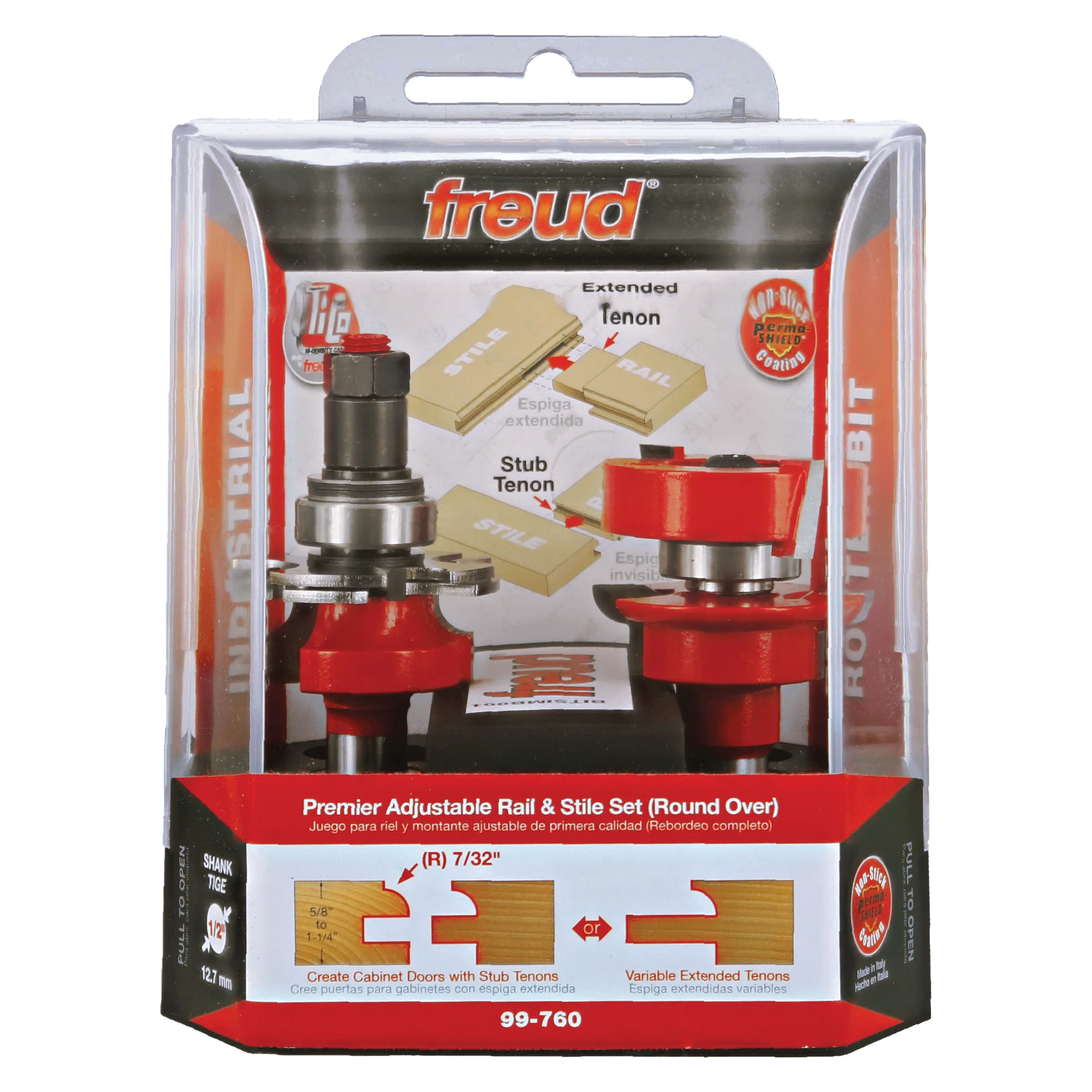Freud's unique Premier Adjustable Rail and Stile System builds perfect doors in material from 5/8" to 1-1/4" thick, and also features Freud's patented technology for producing extra-strong long tenon joints. The System also includes adjustable shims to adjust the panel groove from 7/32"(5.5mm) for thinner plywood panels to 3/8" (9.5mm) thick for larger solid wood raised panels. Offered in five different profiles to suit any project! For even more versatility, add optional cutters to produce double-sided doors, or the optional cutter for glass and screen door construction. Use in table-mounted routers to mill and hardwood or softwood.