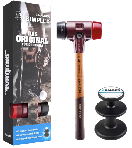 - Contains the Classic from HALDER, the SIMPLEX soft-face mallet D60mm with the insert combination of rubber composition (black, medium hard, impact cushioning, odourless, low-wear) / plastic (red, hard, oil and grease resistant)