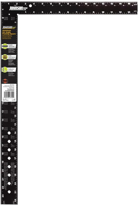 Johnson's 16" x 24" framing square is everything a builder needs to get the work done quickly, efficiently and accurately. It includes graduations in 1/8", 1/10", 1/12" and 1/16" as well as octagon scales, rafter tables, brace tables and board foot tables, making it useful for any number of different jobs. And reading those graduations and conversion tables is especially easy thanks to Johnson's laser-etched EZ Read text. This framing square's aluminum construction makes it conveniently lightweight while also keeping the tool safe from rust.