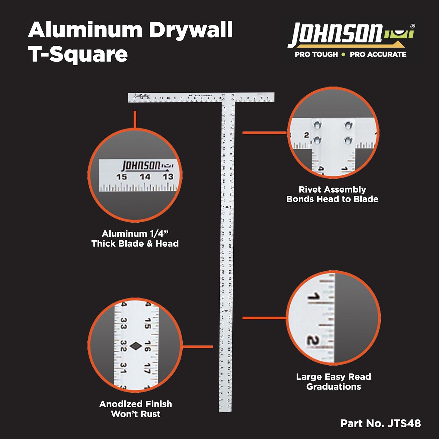 Take errors and guesswork out of your next drywall job with this1,200 mm T-square from Johnson. Johnson's T-square features a unique rivet assembly that permanently bonds the 1/8" extruded aluminum head and blade, so that it stays square for life, while its clear protective anodized finish will keep your tool safe from rust and corrosion. This T-square was also designed to be easy to use. It features thermal-bonded black mm graduations that are large and bold for easy reading.