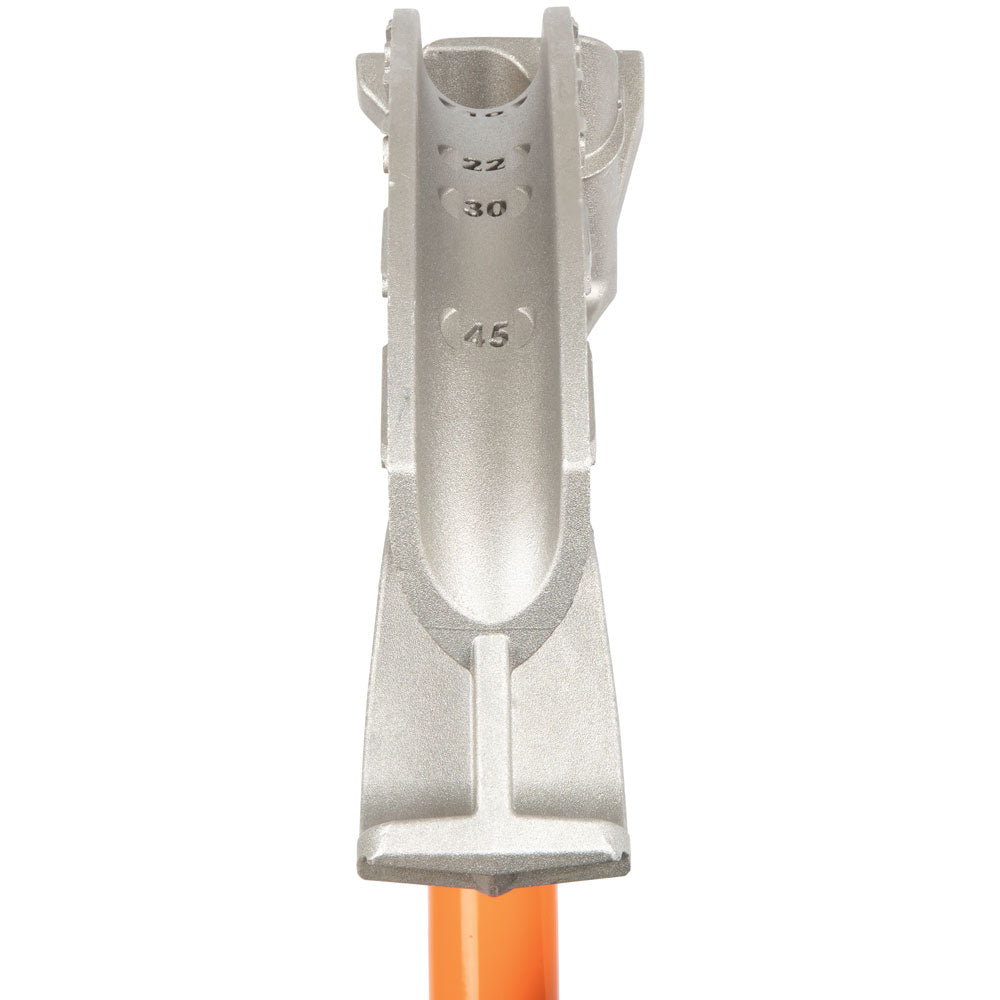 Klein Tools’ conduit benders with Patent Pending Angle Setter™ technology allow for quick, accurate repeated bends. The wide foot pedal provides excellent stability and features angled grooves for extra traction. With easily visible bold cast-in benchmark symbols, degree scales and multiplier scales help save time on the job.