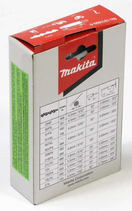 Makita 40C/L Saw Chain is ideal for professional, commercial or occasional users. This low-vibration saw chain is designed for improved comfort when cutting. Twin cutting corners provide improved cutting performance and durability. Oil holes help carry oil around the full length of the guide bar for improved lubrication. It installs quickly for operator convenience. Narrow kerf reduces width of cutting face resulting in the Saw chain move through the cut faster than a standard kerf. Top-plate filing indicators makes sharpening easier. Oil holes help carry oil around full length of guide bar for improved lubrication. Low vibration saw chain ideal for improved comfort when cutting. Pitch 3/8LP, Gauge 0.043 Links 40C/L.