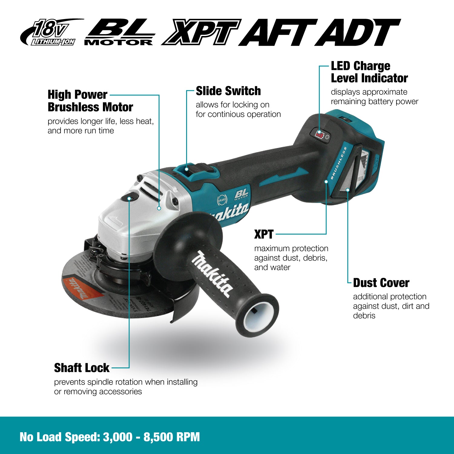 - Active Feedback sensing Technology (AFT) automatically shuts down the tool if there is a sudden drop in rotation speed (e.g. kick-back)