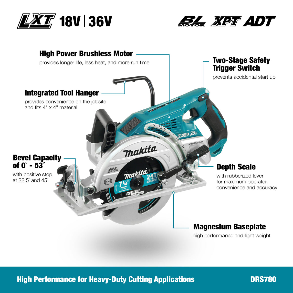 Makita DRS780Z, 18Vx2 (36V) LXT Brushless 7-1/4" Rear Handle Saw (Tool only)