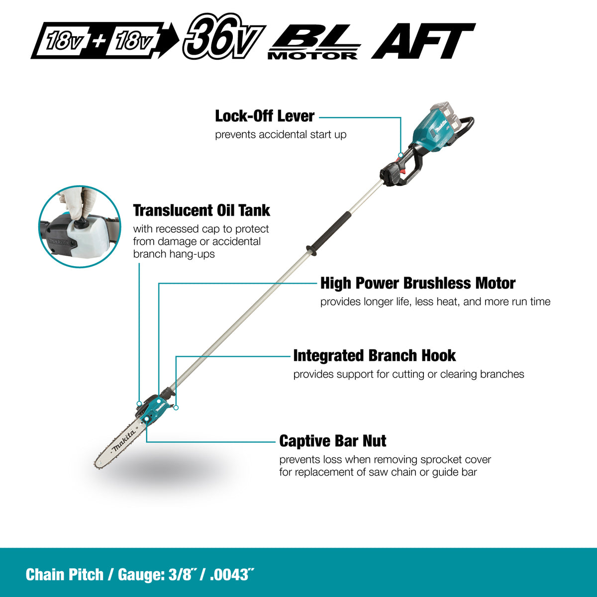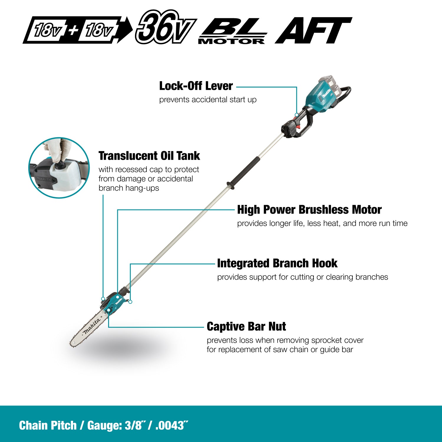 Makita DUA250Z, 36V(18Vx2)LXT Brushless Cordless 10" Pole Chainsaw w/XPT (Tool Only)