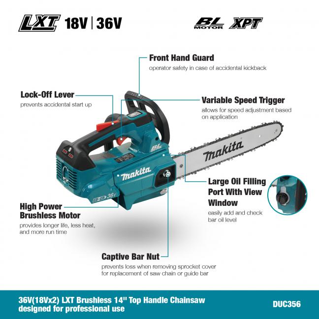 14" / 18Vx2 Top handle LXT Cordless Chainsaw designed for professional use
