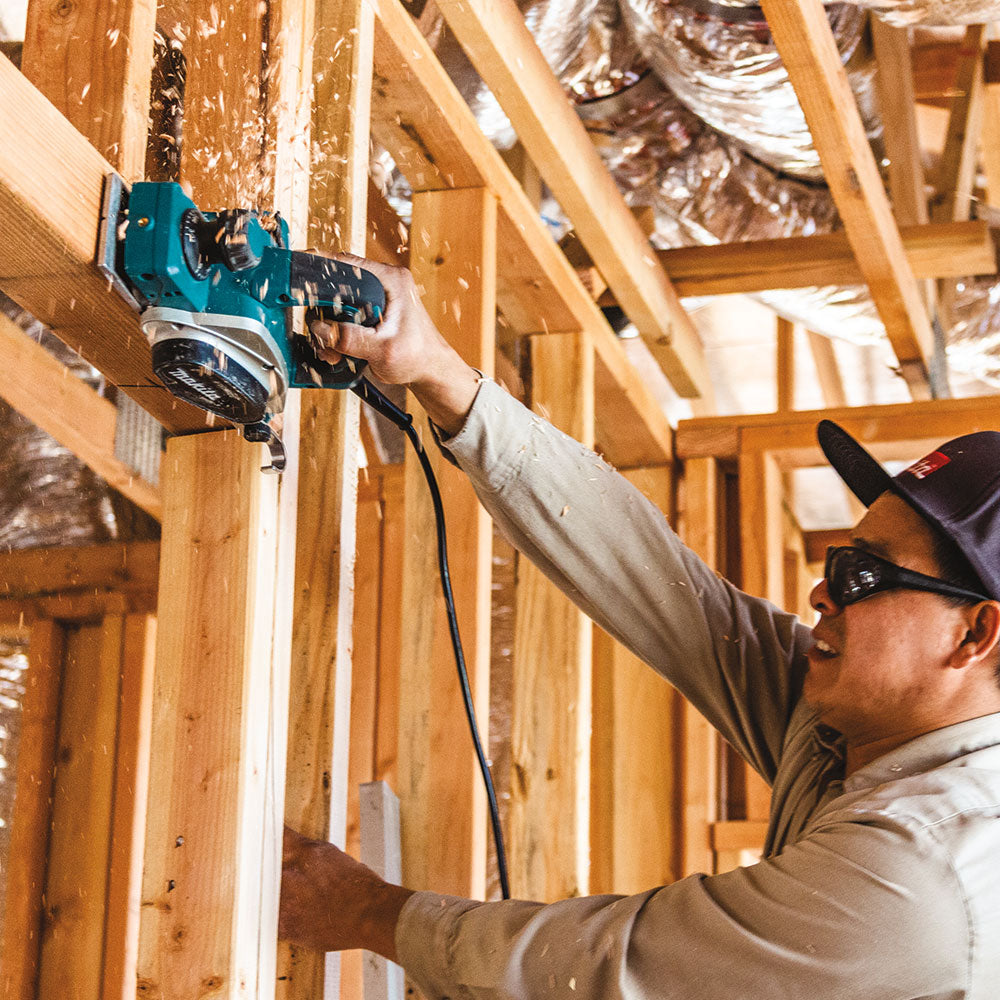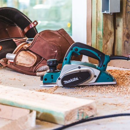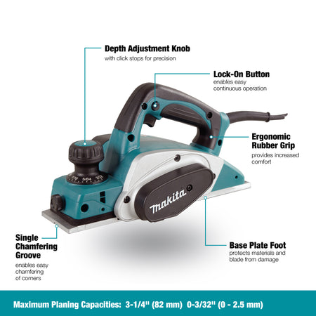 The Makita 3-1/4" Planer provides 34,000 cuts per minute and V groove in base for chamfer cutting. A dial adjustment knob delivers fast, accurate depth adjustment, and a machined aluminum base for precision accuracy. Features a 4 amp motor, double-edged tungsten carbide mini blades and lock on button for continuous operation. Includes blade gauge assembly, socket wrench, guide rule, double-edged carbide blade set.