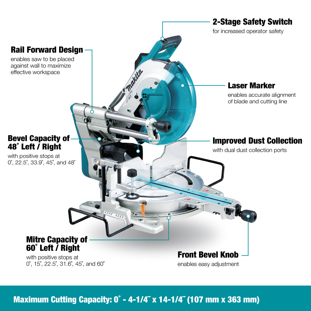Incorporates Makita's Deep And eXact Cutting Technology (DXT) Up To 15" Cuts In 2x Material, 8" Nested Crown Moulding and 6-3/4" Vertical Baseboard