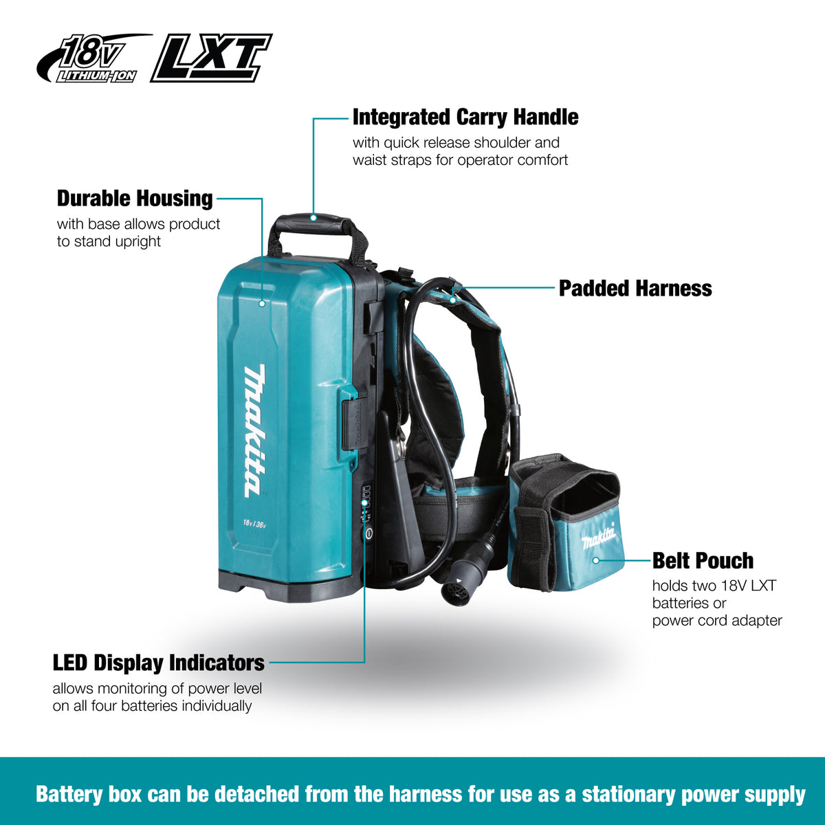 - Backpack utilizes four 18V LXT batteries providing longer run time on 18Vx2 / 18V LXT power tools