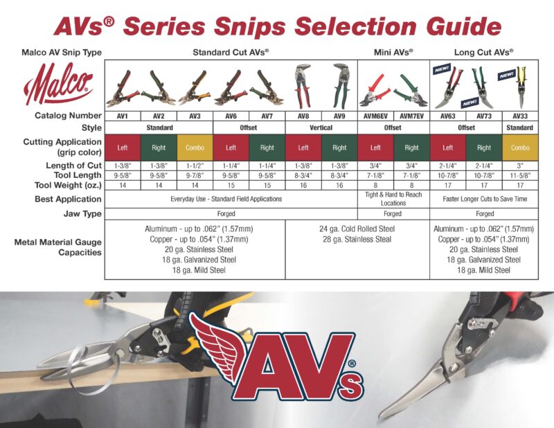 This AVs® Snip features Malco’s POWER-FIT Performance Hand Grips™ that increase productivity and distributes pressure evenly, which results in less user fatigue. Non-slip grooves and safety guards also help users achieve a maximum grip in some of the dirtiest conditions. An easy release side latch offers quick operation and cutting on the job. The hardened forged steel jaws offer a strong long lasting cutting edge.