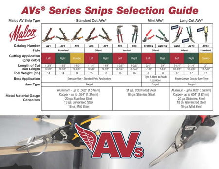 Malco Long Cut AVs® produce longer and faster cuts with their long blade design. The AV33 model is a combo snip featuring a yellow-colored grip with straight, right, and left cutting capabilities.