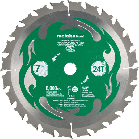 Metabo HPT premium VPR blades are laser-cut from high quality Japanese steel to maintain durability and cutting precision. These superior blades are ideal for dry wood applications such as ripping, cross cuts, and miter cuts. Tungsten carbide tips are carefully welded to each blade tooth using computerized technology to control the exactness of the saw blades. An automated grinding process yields accurate tip geometry to increase the life and performance of the ATB C3 carbide teeth. This premium line of vpr blades is perfect for all cutting needs from framing and ripping to fine finish woodworking. Features include: industrial high performance micro grain tungsten carbide - micro grain structure provides extreme durability and longevity. Tri-metal shock resistant brazing - brazing the carbide tips allows the tips to withstand extreme impact for maximum durability. Large micro grain carbide teeth: allows professional resharpening and prolongs blade life. Laser-cut expansion slots - reduce vibration and noise keeping the blade running cooler. Electrophoresis coating - protects against rust.