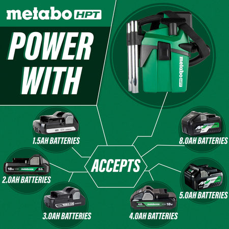 The pro preferred brand of Pneumatic Nailers introduces the 18V Cordless 1.6 Gallon Wet/Dry Vacuum (model - RP18DAQ4). Whether you need to reduce saw dust exposure at the jobsite or have a water leak at home, this cordless vacuum is the ideal solution for any application that requires a quick cleanup with over 74 CFM of air volume. Easily change between eco mode and boost mode for either longer runtime or maximum performance. At only 9.0 lbs (without battery), this lightweight wet/dry vacuum tackles any mess. It also includes a HEPA filter to ensure optimal air quality and safety. With multiple attachments, a shoulder strap, and a PRESSCLEAN function to keep the HEPA filter clean, this 18V cordless 1.6 gallon vacuum is for you! The 18V Cordless 1.6 Gallon Wet/Dry HEPA Vacuum is a part of the expanding MultiVolt System of 18-Volt and 36-Volt power tools from Metabo HPT. GO light with 18V batteries or GO longer with the unique MultiVolt battery that works on both 18V and 36V tools to double your runtime for up to 8.0Ah of runtime per charge for more power on the GO.