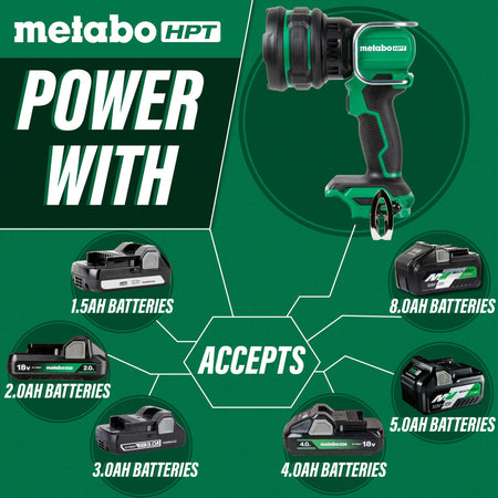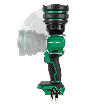 The Pro Preferred Brand of Pneumatic Nailers introduces a 18V Cordless Handheld Spotlight! Whether you're on the job site or at home, bring the 18V MultiVolt Cordless Spotlight model - UB18DHQ4 with you. This LED spotlight is perfect for any application that requires a versatile lighting solution thanks to the 4 different light settings and two brightness modes. It produces a staggering 450-1050 lumens in Wide Mode and 400-950 lumens in Spot Mode. At only 1.8 lbs., this cordless light is easy to carry around the jobsite without weighting you down. Illuminate up to 730 yards on highest setting to see anything in your path. To increase accessibility, we've included not one , but two hooks (belt + utility) for easy access. With these astounding settings and options, you can be confident that all of your jobs will be covered and brightened with Metabo HPT's Handheld Spotlight. The UB18DHQ4 18V Cordless LED Handheld Spotlight is a part of the ever expanding MultiVolt System of 18-Volt and 36-Volt power tools from Metabo HPT. GO lighter with 18V batteries or GO longer with the unique MultiVolt battery that works on both 18V and 36V tools to double your runtime for up to 8.0Ah of runtime per charge for more power on the GO.