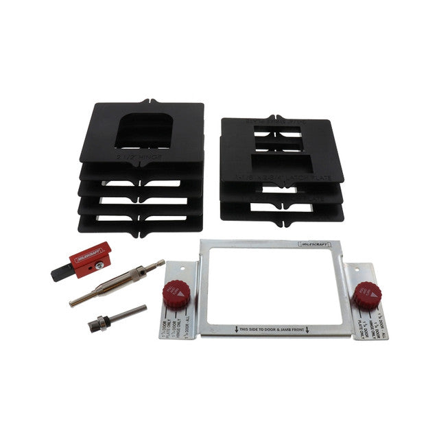 - Contains templates needed to rout hinge, strike plate, and latch plate mortises