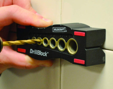 The Milescraft DrillBlock™ drill guide allows you to drill straight holes all of the time, on many different drilling surfaces. On the drill guide bushing block, there are 6 holes for common drill bits sizes. The bushing block is held at a tight tolerance and allows you to drill a hole 90° to any surface, centered on a round item or even directly into the corner of your project.