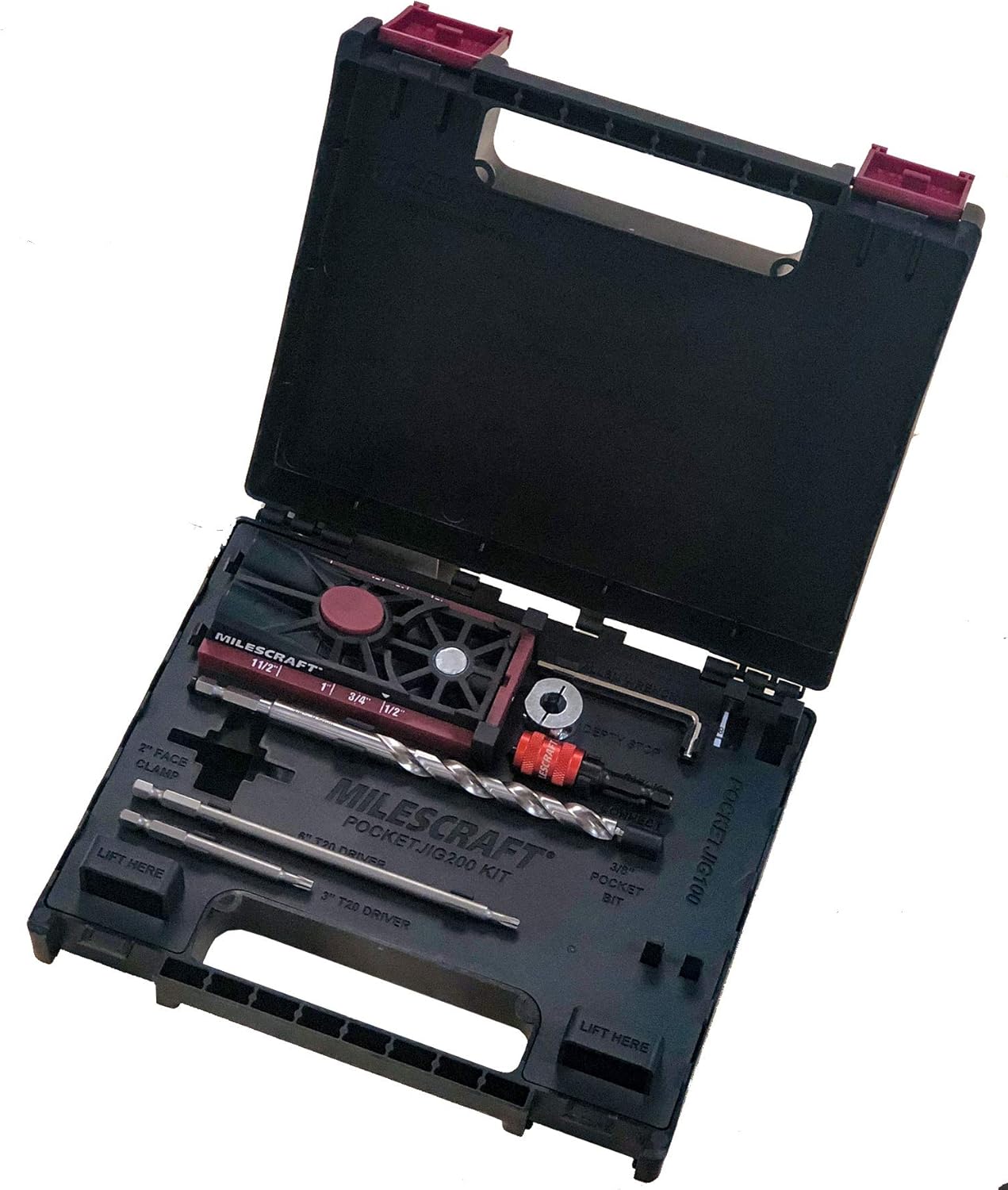 The Milescraft® PocketJig200™ allows you to connect your workpieces quickly with strong and accurate pocket hole joints. Create corner joints, edge joints, T-joints, framing joints, miter joints, and make repairs. With built-in settings for different board thicknesses, just set this pocket jig to your desired setting, set the depth of your bit, and start drilling. This complete kit in a sturdy carrying case comes with all of the bits, drivers, screws and accessories needed to complete any pocket hole project.