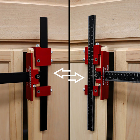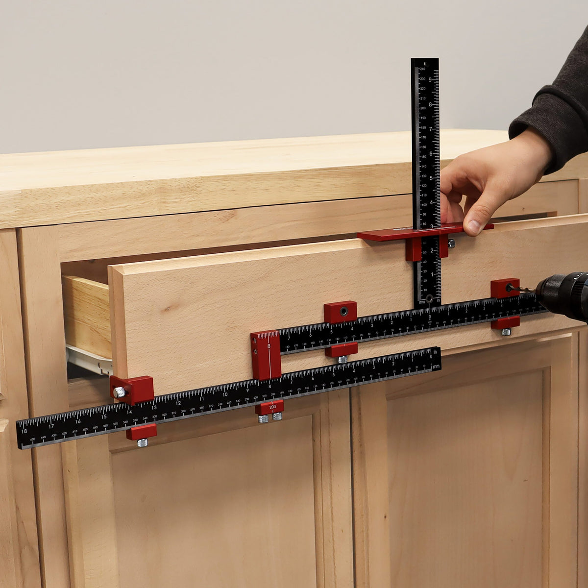 Attaching the included Extension Ruler expands the range. With spacing from 1-1/4” to 32”, wide drawers, tall doors, and long hardware are easily installed. Convenient centering notches allow alignment of the jig to center marks and the drill guides can be adjusted from zero.