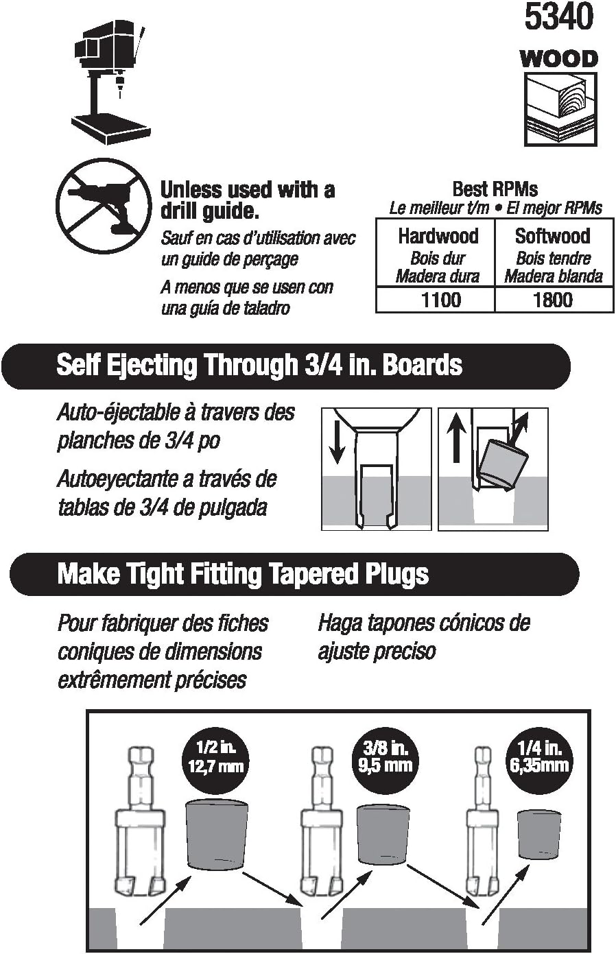 - Plugs self-eject when drilling through 3/4″ thick boards
