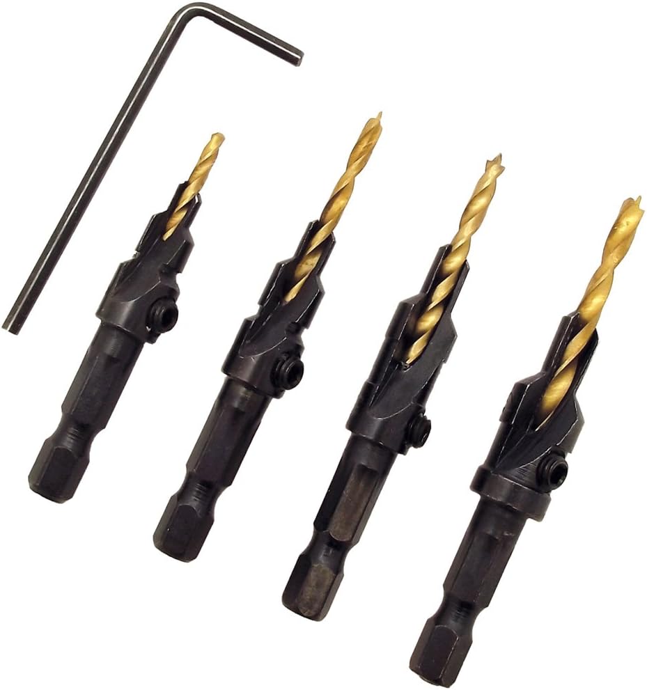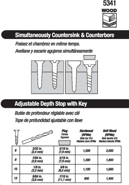 In one step you can drill, countersink, and counterbore the perfect sized hole for #6, #8, #10, and #12 screws. Countersink to drive the head of the screw flush with or slightly below the surface. The drill bits are adjustable for different length screws.