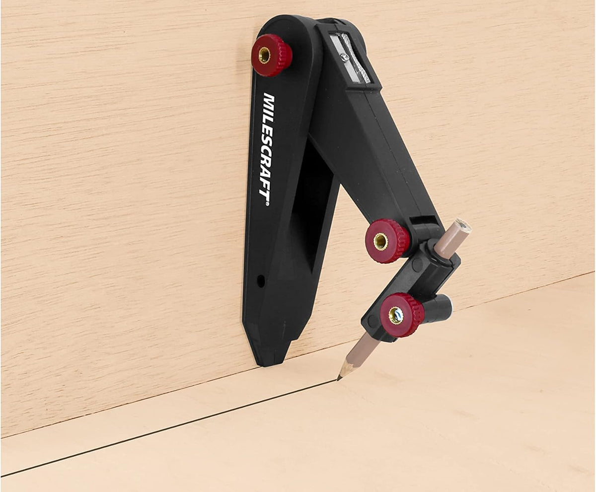 The ScribeTec™ from Milescraft® is a flexible marking tool with multiple uses around the shop. The articulated arms allow you to adjust to any surface or contour. The tool easily maintains a consistent scribe offset that stays parallel to the work surface every time. The ScribeTec is ideal for scribing molding, cabinet trim, flooring, and a variety of other projects.