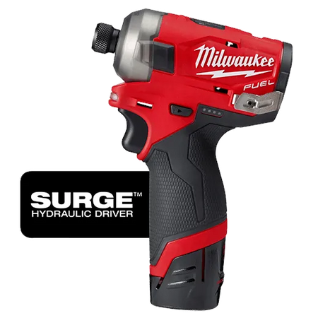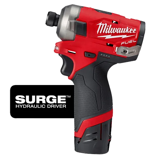 Our M12 FUEL SURGE™ ¼” Hex Hydraulic Driver is the industry's first 12-volt hydraulic driver. Featuring our FLUID-DRIVE™ Hydraulic Powertrain, the hydraulic driver will let you experience operation up to 2X quieter with less vibration for smoother and faster driving speeds compared to standard impacts. The compact size of the tool and battery give you unmatched access in tight spaces and allows for easy transport on a tool belt and easy fitting into your job site tool bag. The POWERSTATE™ Brushless Motor delivers up to 0-3,200 RPM with constant power output to drive screws faster. Built-in REDLINK PLUS™ Intelligence is the most advanced electronic system on the market, preventing damage to your tool and battery caused by overloading or overheating. The cordless hydraulic driver is compatible with all Milwaukee® M12™ REDLITHIUM™ Compact Batteries or Extended Capacity Batteries, providing you with more work per charge and more work over the life of the pack than competitive batteries. The impact driver's 4-Mode DRIVE CONTROL gives you greater control over output speed and power for greater versatility in a wide range of applications. Self-Tapping Screw Mode reduces walking when you are self-tapping screws as well as reduces overdriving, breaking and stripping out screws.