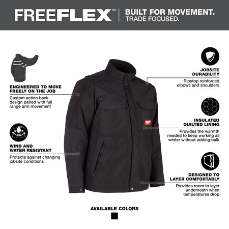 Part of our MILWAUKEE® FREEFLEX™ Collection, the Insulated Jacket is BUILT FOR MOVEMENT. Our FREEFLEX™ Jacket is designed with stretch panels across the back and built with lighter, more durable materials that maximize mobility. This durable jacket features a quilted lining and protection against wind and water to work hard in cold conditions. Focused on providing reinforcement in areas where traditional workwear fails, the FREEFLEX™ jacket provides ultimate pocket durability and resistance to abrasive materials. Milwaukee FREEFLEX™ products are developed in collaboration with feedback from users across the trades through continuous jobsite research.