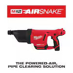The M12 AIRSNAKE Drain Cleaning Air Gun is the industry’s first drain cleaning machine designed to clear through drain covers and traps with powered air. The M12 AIRSNAKE allows users to clear clogged drains while leaving fixtures and drain covers intact. Designed for 1"-4" drain lines, the M12 AIRSNAKE has the power to clear up to 35 feet, past vent stacks and tees while the variable pressure dial allows for control on delicate pipe systems. Powered air flushes water out of pipes, completely removing grease and sludge from pipe walls. With the ability to work over sinks and eliminate retrieval mess, Drain Professionals, Plumbers, and Facility Maintenance will be able to work faster when clearing clogs. The M12 AIRSNAKE is powered by REDLITHIUM Batteries, which deliver more work per charge and more work over pack life than competitors. REDLINK Intelligence provides optimized performance and overload protection against abusive situations.