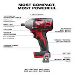 The M18™ Cordless 1/2" Compact Impact Wrench is the most powerful 1/2" compact impact wrench in its class and offers the best power to size ratio among like competitors. Featuring a Milwaukee® built 4-Pole frameless motor and optimized impact mechanism, this impact driver delivers up to 2,450 RPM, 3,350 IPM and 183 ft-lbs of fastening torque for class-leading performance. REDLINK™ Intelligence provides optimized performance and overload protection using total system communication between tool, battery and charger. The M18™ Cordless 1/2" compact impact wrench features a 1/2" Pin-Detent anvil for maximum socket retention, an LED Light to illuminate work surfaces, and includes an all-metal, reversible belt clip for temporary tool storage.