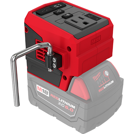 Our M18™ TOP-OFF™ 175W Power Supply delivers faster simultaneous power to personal devices and small electronics. Attach any M18™ battery to provide continuous power or recharge devices with (1) AC 120V outlet, (1) USB-C PD port, and (1) USB-A port. You can quickly charge up to three devices at the same time, without the barriers of speed throttling. By connecting any USB-C cable to the USB-C PD port (45W), this battery inverter is capable of recharging devices, from a fully depleted state to 80% capacity, up to 75% faster than conventional wall chargers (5W). The MILWAUKEE® compact portable power supply has an attached metal rafter hook that can be extended to hang it from carts, lumber, or other jobsite materials when worksurface space is limited. You can instantly set up a mobile workstation or keep electronics securely within eyeshot, rather than making frequent trips to a wall outlet.