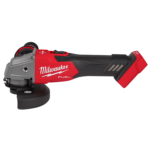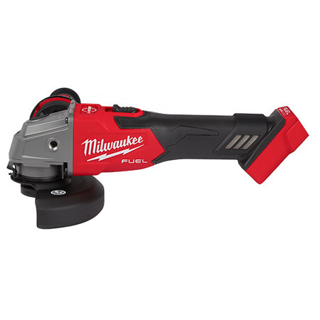 The MILWAUKEE M18 FUEL 4-1/2" / 5" Grinder SlideSwitch, Lock-On is the next advancement in power and performance, generating 11A corded power, fastest cutting, and delivering up to 135 cuts per charge. The M18 FUEL 4-1/2" / 5" Grinder generates 11A corded power allowing completion of the toughest grinding and cutting applications, all on the M18 cordless system. The POWERSTATE Brushless Motor delivers maximum sustained power and 8,500 RPM to remove material faster and increase productivity. REDLINK PLUS Intelligence ensures unmatched levels of performance, protection, and compatibility. The M18 FUEL 4-1/2" / 5" Grinder includes an electronic clutch for kickback protection, as well as overload protection to maximize motor life. The M18 REDLITHIUM HIGH OUTPUT XC6.0 Batteries (not included) deliver 50% more power while running 50% cooler than our M18 REDLITHIUM XC Batteries and are compatible with 200+ Tools in the M18 System. Experience faster accessory changes and less downtime with tool-free accessory and guard adjustments while remaining fully compatible with the most common accessories in the market. The M18 FUEL 4-1/2" / 5" Grinder takes cordless grinders to the next level in performance and run-time.