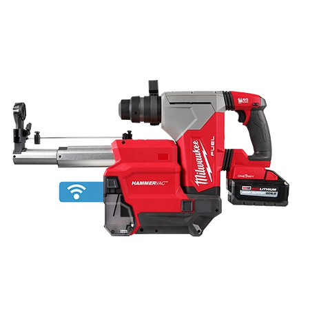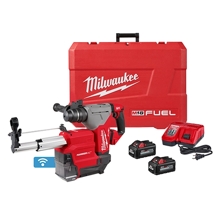 The M18 FUEL 1-1/8in SDS Plus Rotary Hammer with ONE-KEY & HAMMERVAC Dedicated Dust Extractor Kit is the next generation of cordless rotary hammers, delivering you ultimate jobsite performance and productivity. The M18 FUEL 1-1/8in SDS Plus Rotary Hammer is the fastest drilling and hardest-hitting rotary hammer in its class with AUTOSTOP Control for enhanced safety, drilling up to 50 5/8 x 3in holes per charge when paired with the M18 HIGH OUTPUT XC6.0 Battery. This cordless hammer drill provides maximum control and enhanced safety with the AUTOSTOP Kickback Control. This feature prevents over-rotation if the tool gets bound up while drilling in rebar or hard aggregate. The MILWAUKEE M18 FUEL HAMMERVAC 1-1/8in Dedicated Dust Extractor features an inline design engineered to connect directly to and be power by the M18 FUEL 1-1/8in SDS Plus Rotary Hammer. Utilizing the same replaceable certified HEPA filter as other HAMMERVACS, which filters 99.97% of all particles greater than 0.3µm, means more compatibility on the jobsite. The built-in adjustable depth stop and ruler offer easy and precise adjustments. This dust extractor has OSHA Table One Compliance for respirable crystalline silica when drilling up to 1-1/8in in diameter and 8in in depth. This extractor features AUTOPULSE Filter Cleaning Mechanism that automatically cleans the filter after each use. The dust box comes equipped with a vacuum port for suctioning out the dust with a large vacuum or dust extractor instead of dumping the dust out into a trash receptacle.