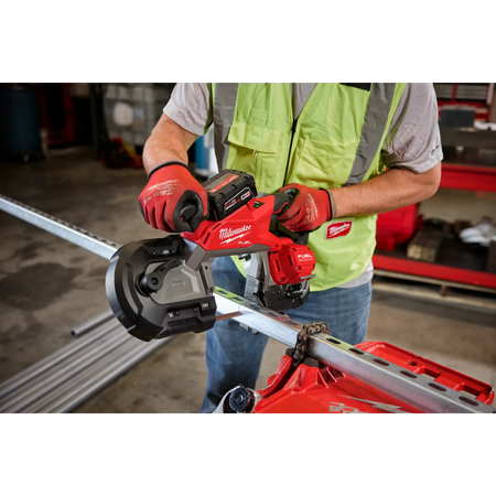 Milwaukee's M18 FUEL Deep Cut Band Saw delivers user-demanded performance with the ability to cut faster on a 4" Black Iron Pipe than competitors. Also being lightest in its class, this Band Saw provides an overall better cutting experience. Milwaukee's cordless Deep Cut Band Saw provides users with up to 78 cuts per charge, eliminating multiple trips to the charger onsite. The POWERSTATE brushless motor delivers maximum power, and 550 sfpm to remove material faster and increase productivity. This Band Saw is supplied with Variable Speed Mode Select, and a feathering trigger to allow for control over the speed of cut on thicker metals. A tool-free adjustable shoe, to help guide the user through a straighter cut, and an LED Worklight to illuminate their application. This Band Saw is equipped with features to enhance the control of their cut while maximizing their cutting experience throughout the day.